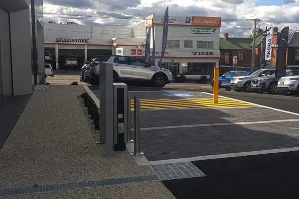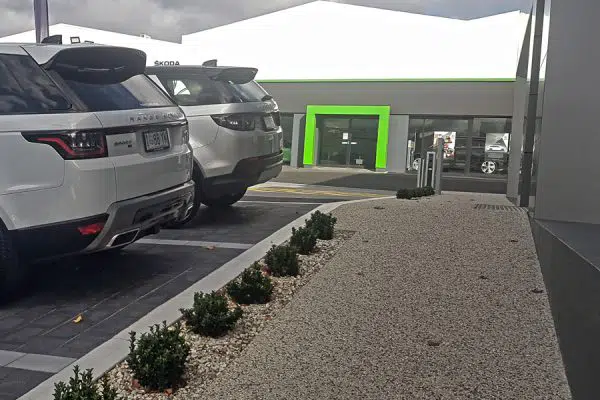 Interesting materials for the project included Pavers for the Future trafficable pavers made from recycled glass aggregates, an environmentally sustainable, Global Green Tag certified product. Additionally, the gravel garden mulch was stabilised with Pebblecrete porous resin, allowing water to drain through the gravel but retaining the gravel in place in the garden bed – a valuable feature for a new car showroom!