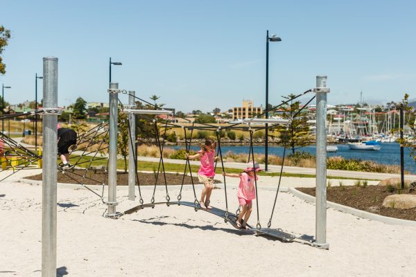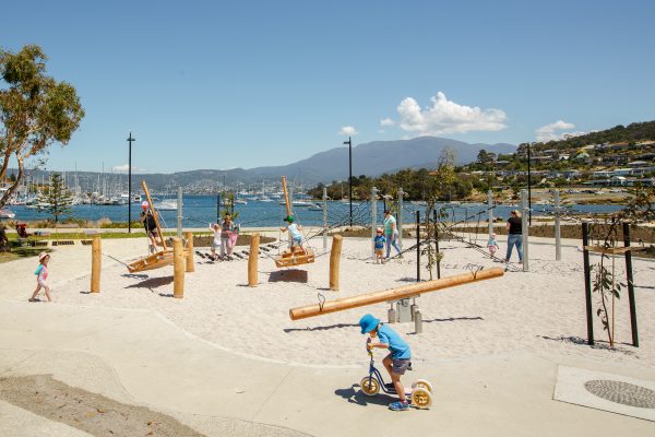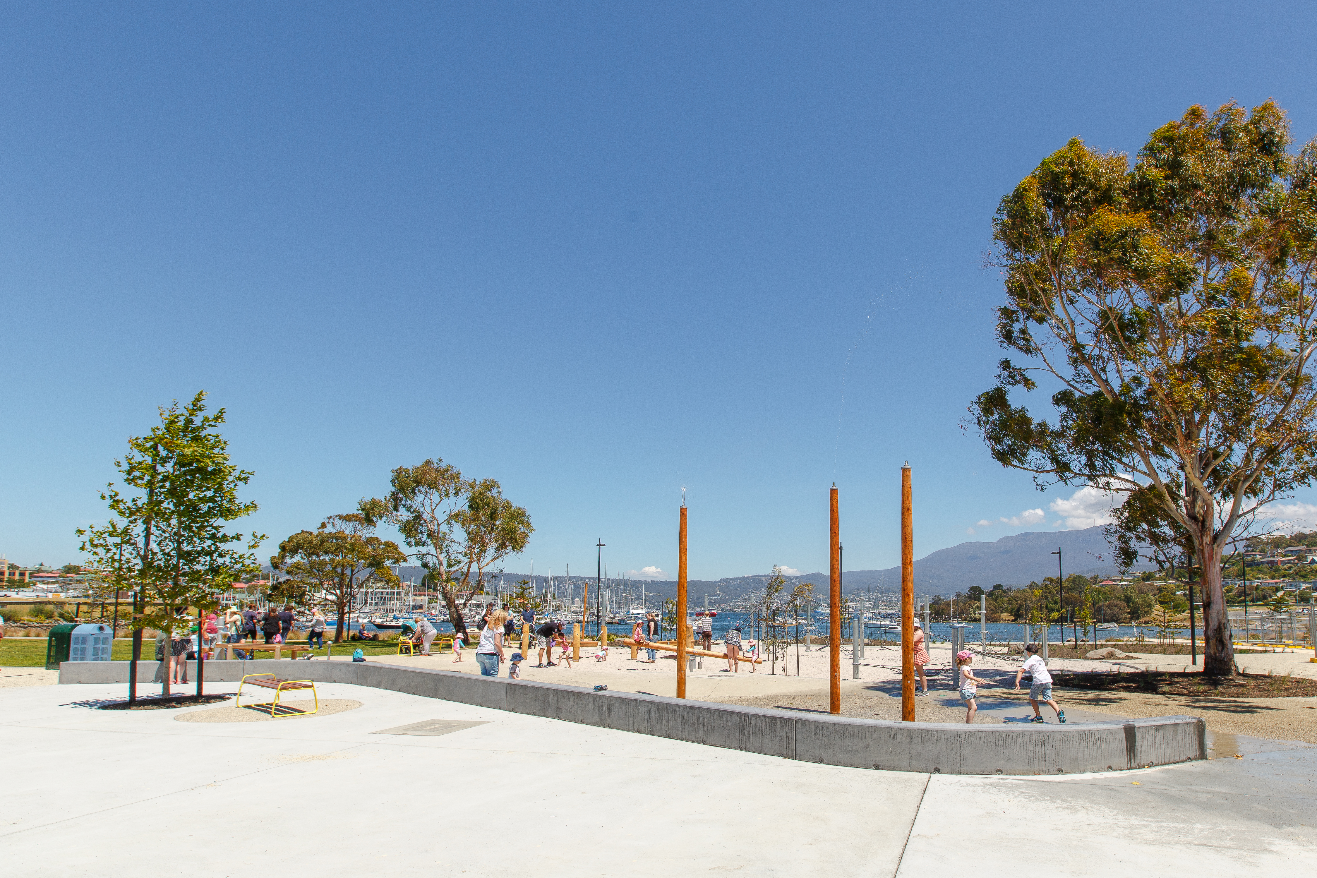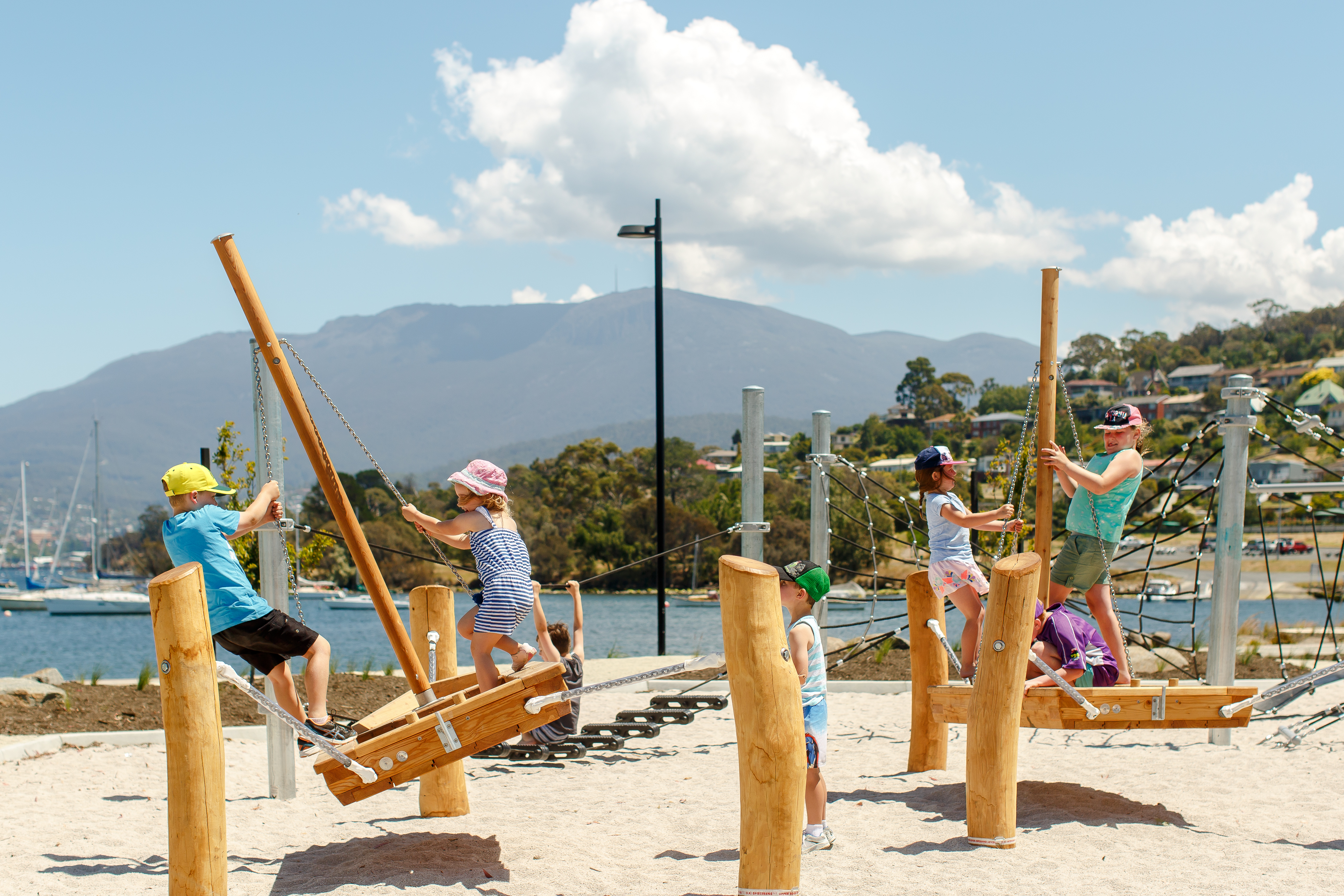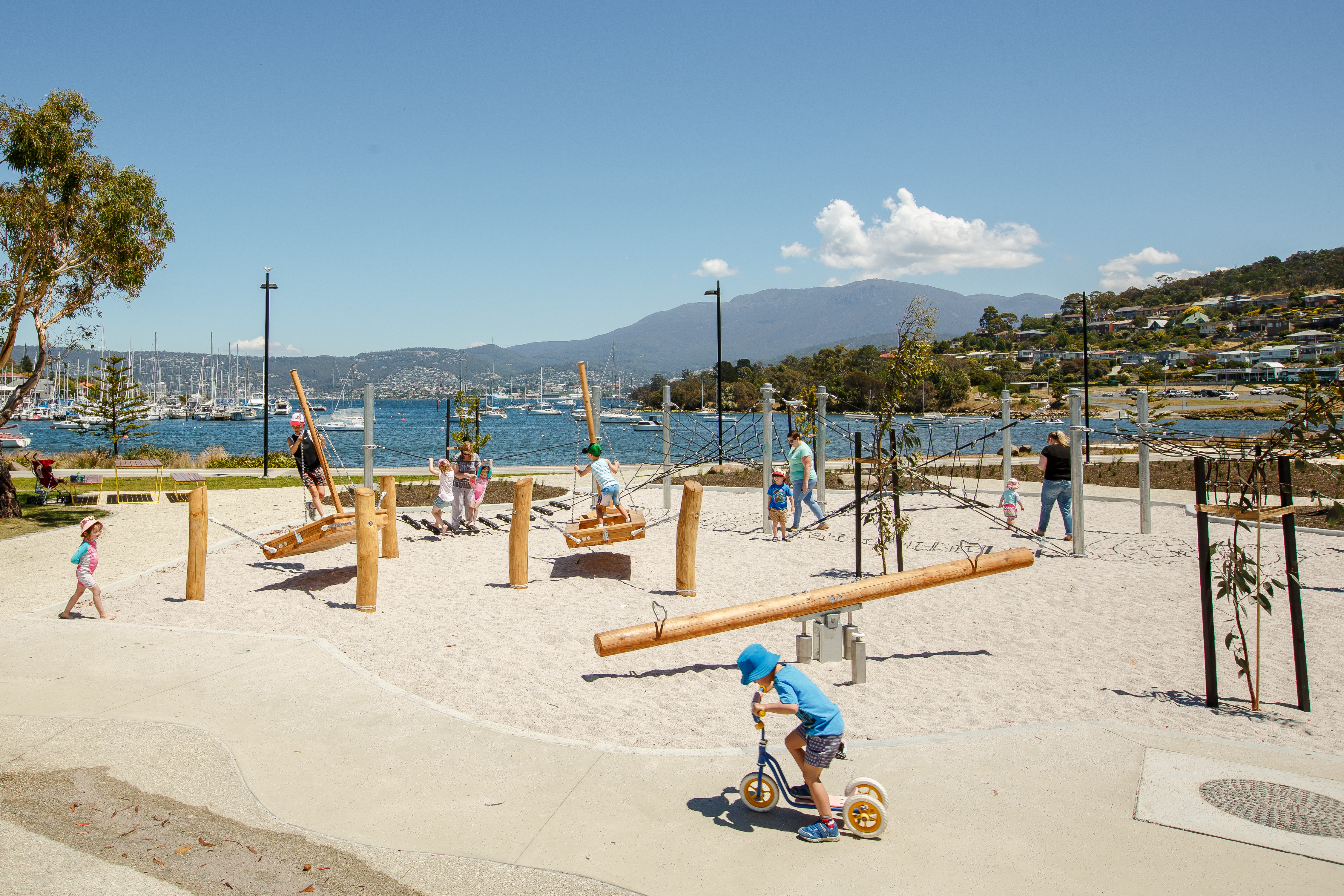 The concept of the design was inspired by the area’s historic links to fishing boats and river crossings, with net play and wooden fishing boat play pieces all facing the Derwent River and with a brilliant view looking across the river to Mt Wellington/Kunyani. Project highlights include the large picnic shelter, a large water play zone, and granite cobblestone breakout paving areas.
