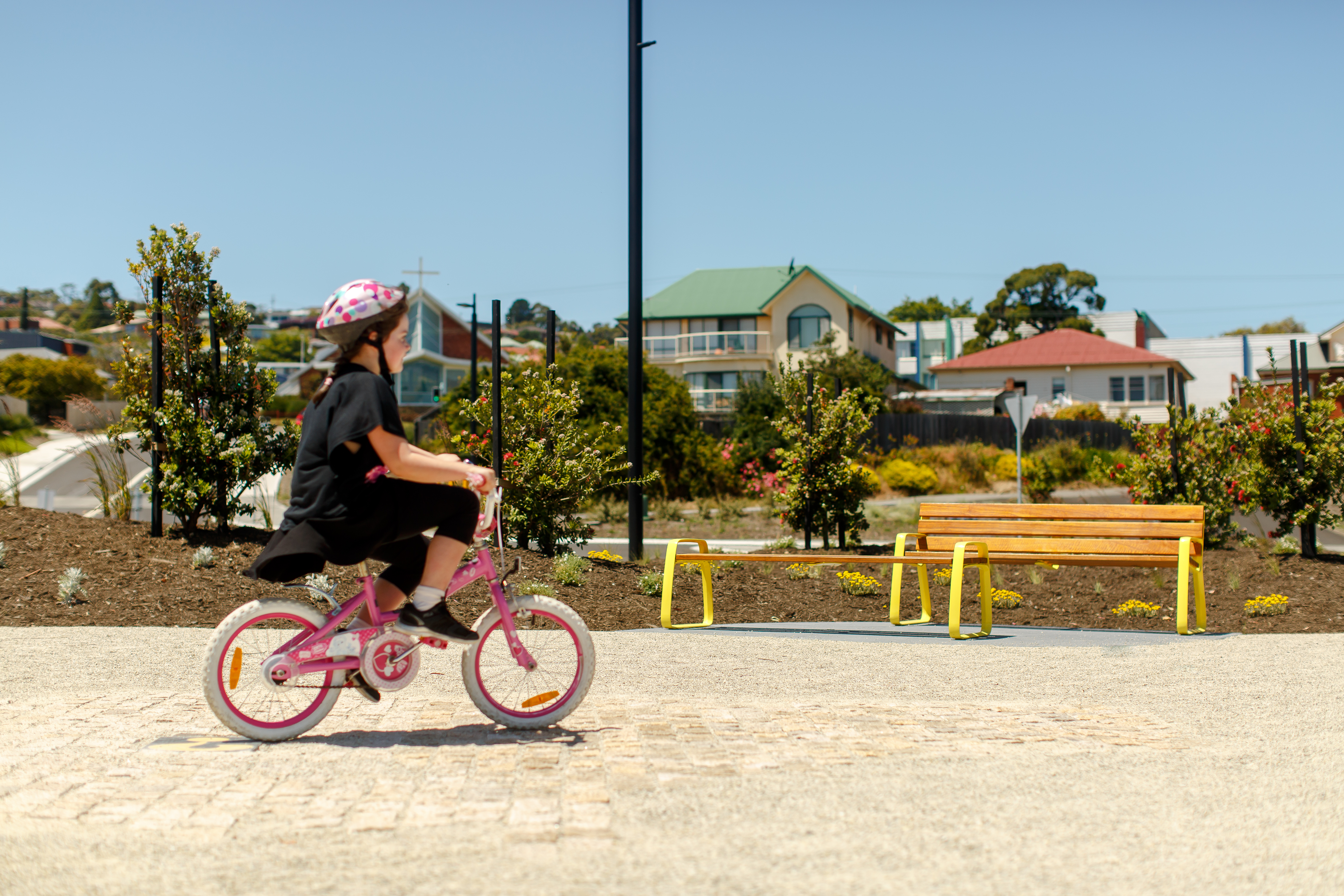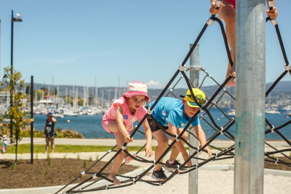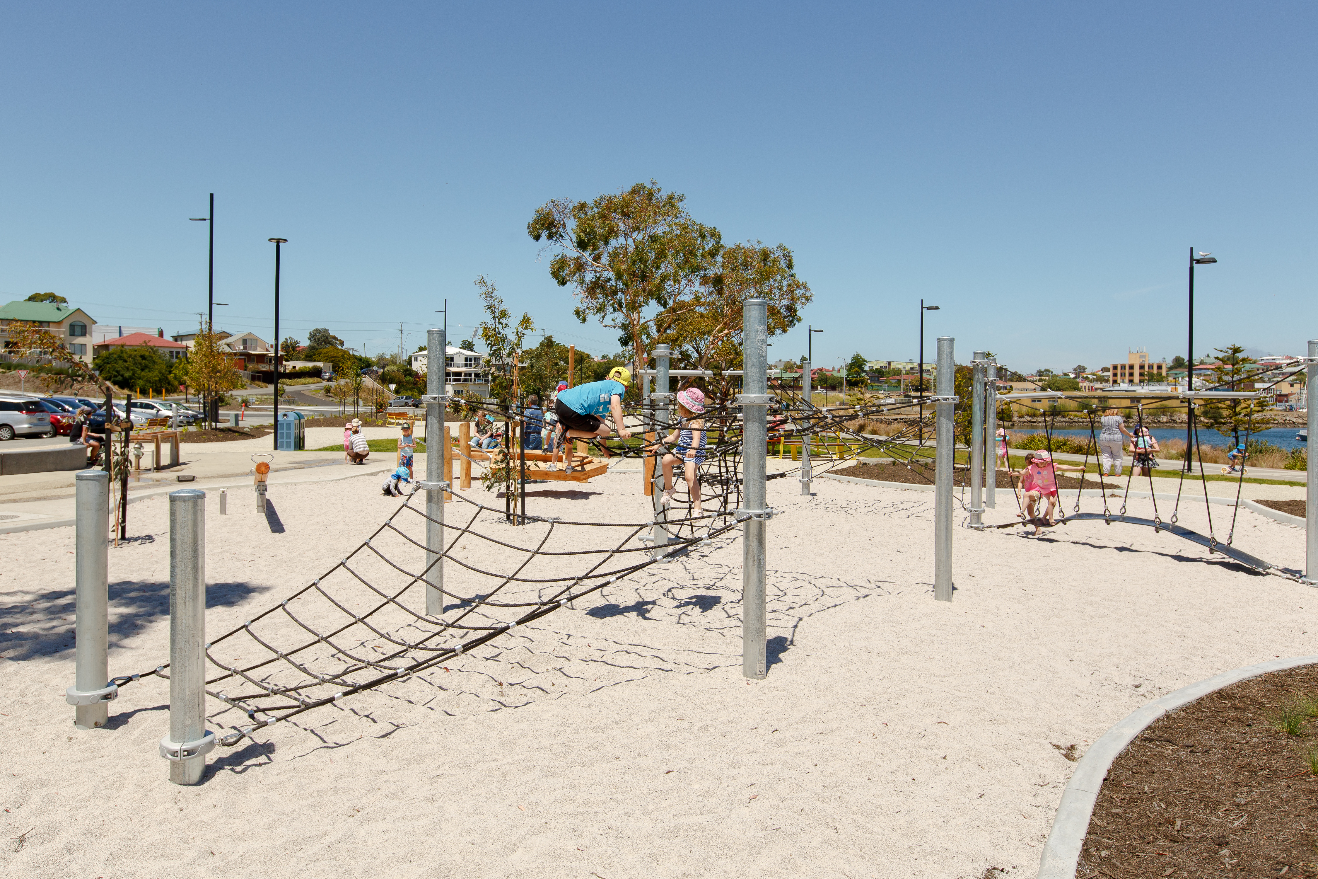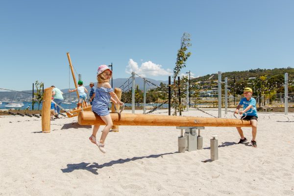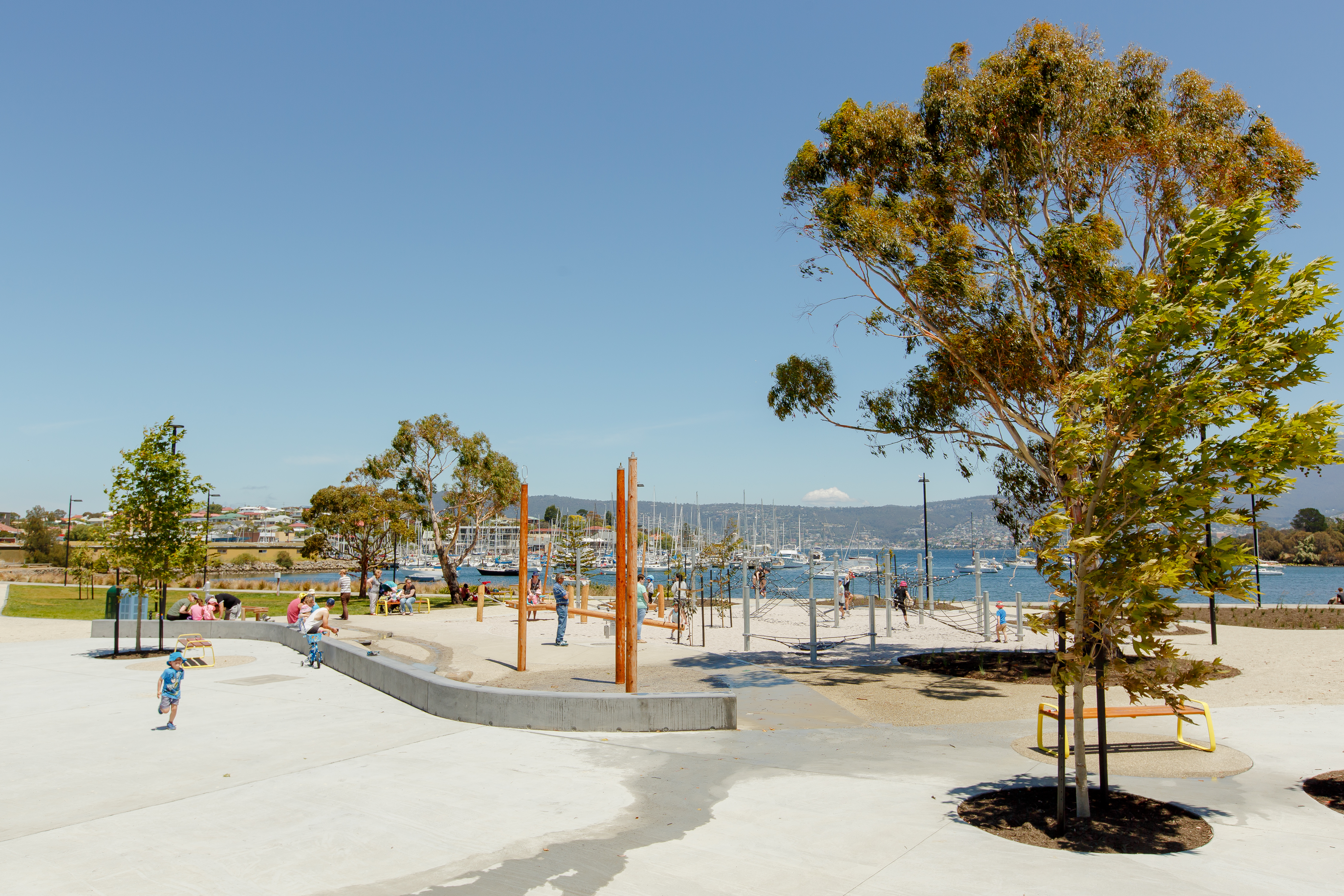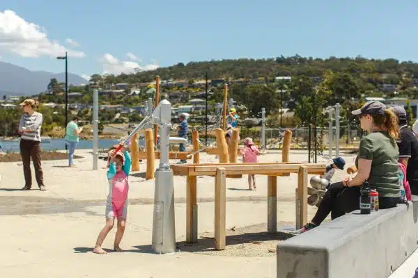 The concept of the design was inspired by the area’s historic links to fishing boats and river crossings, with net play and wooden fishing boat play pieces all facing the Derwent River and with a brilliant view looking across the river to Mt Wellington/Kunyani. Project highlights include the large picnic shelter, a large water play zone, and granite cobblestone breakout paving areas.