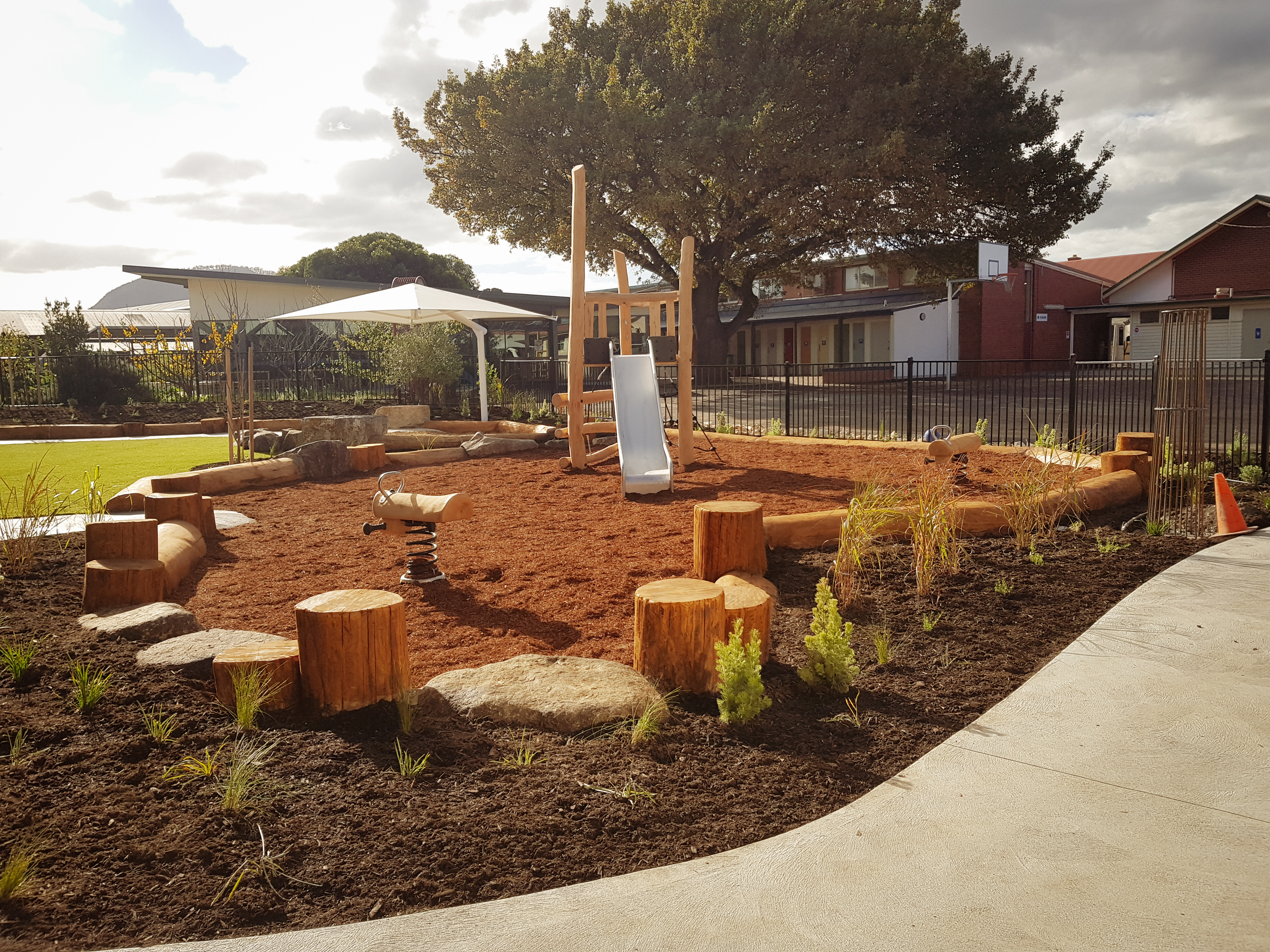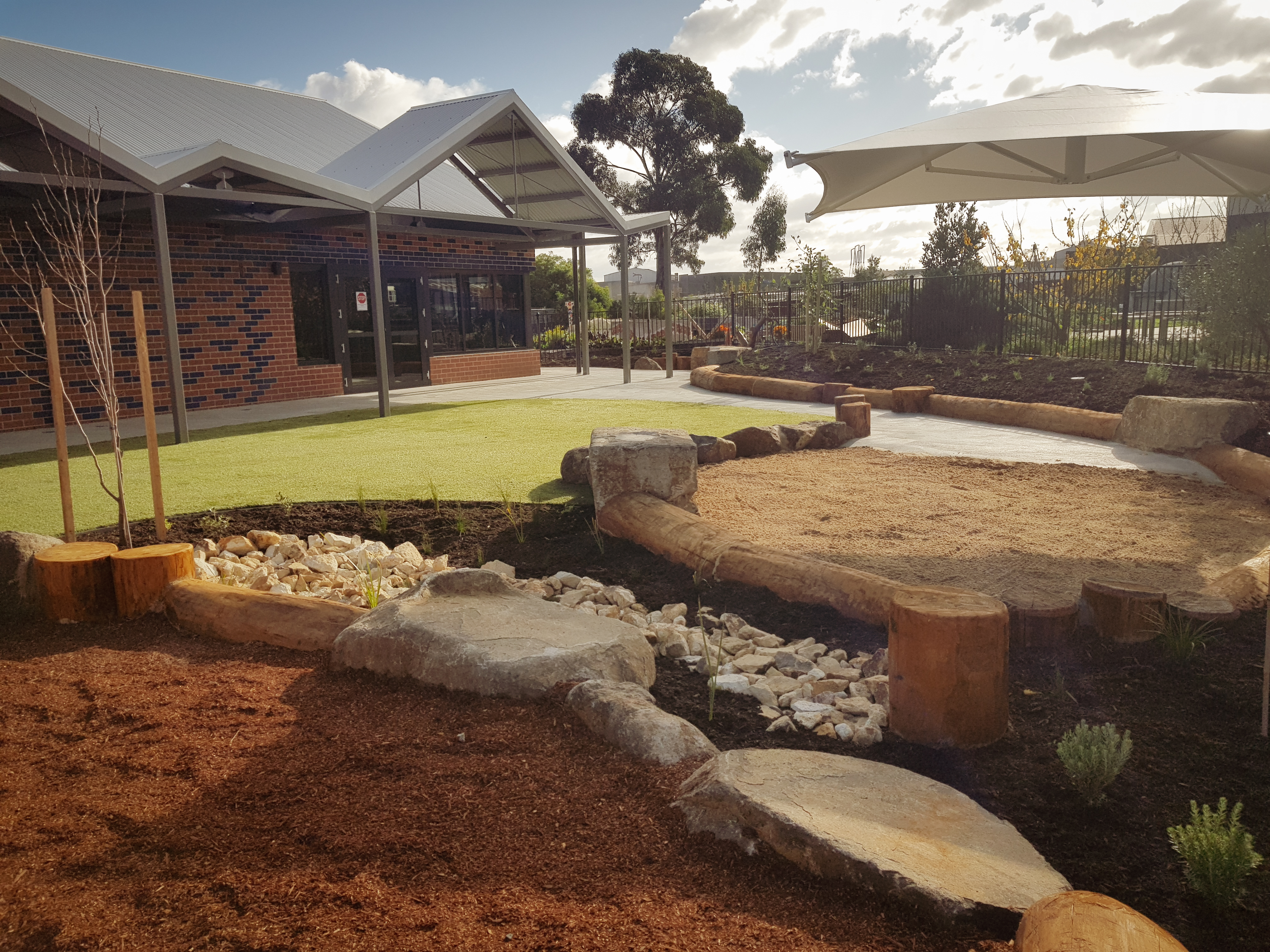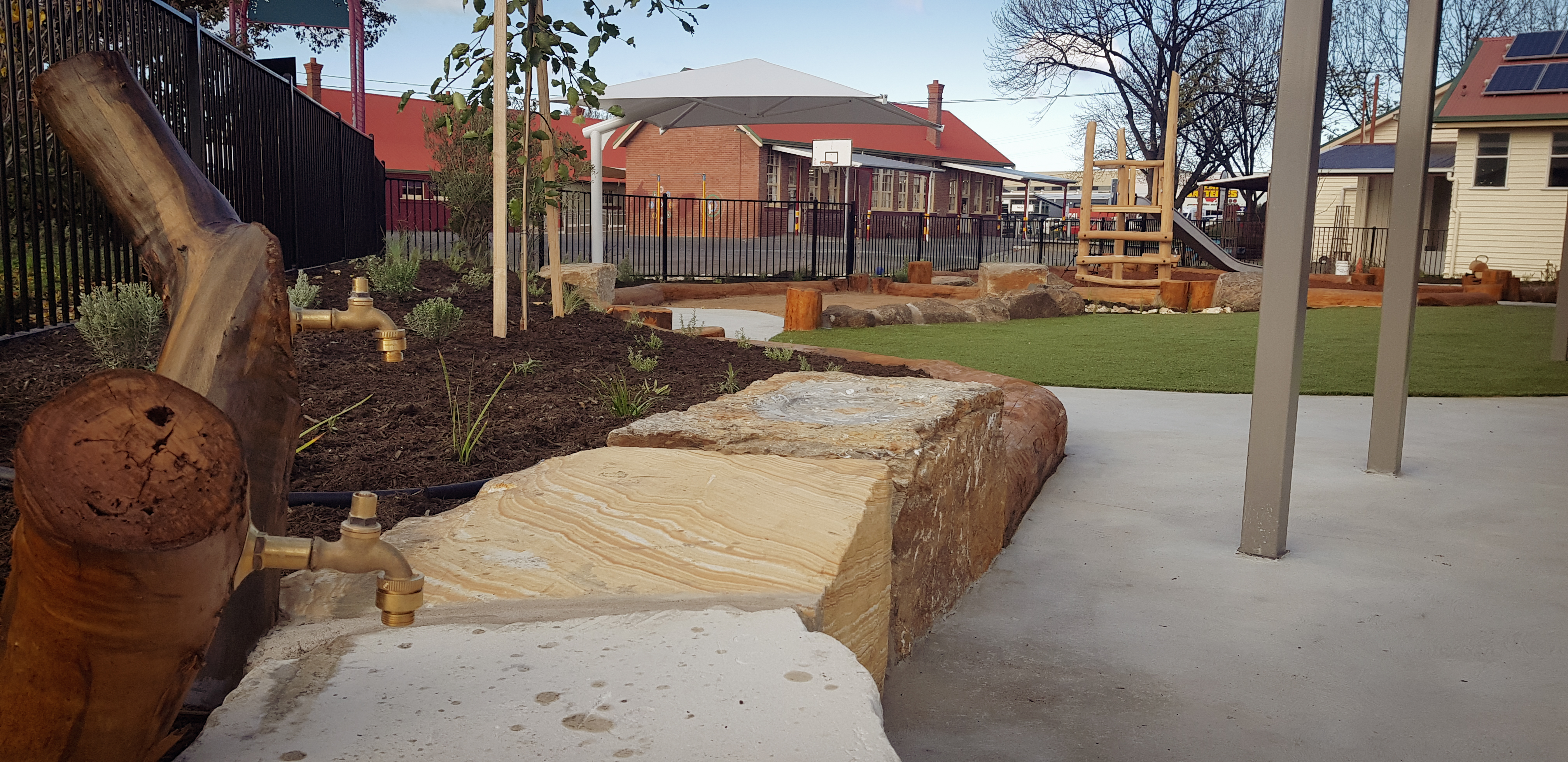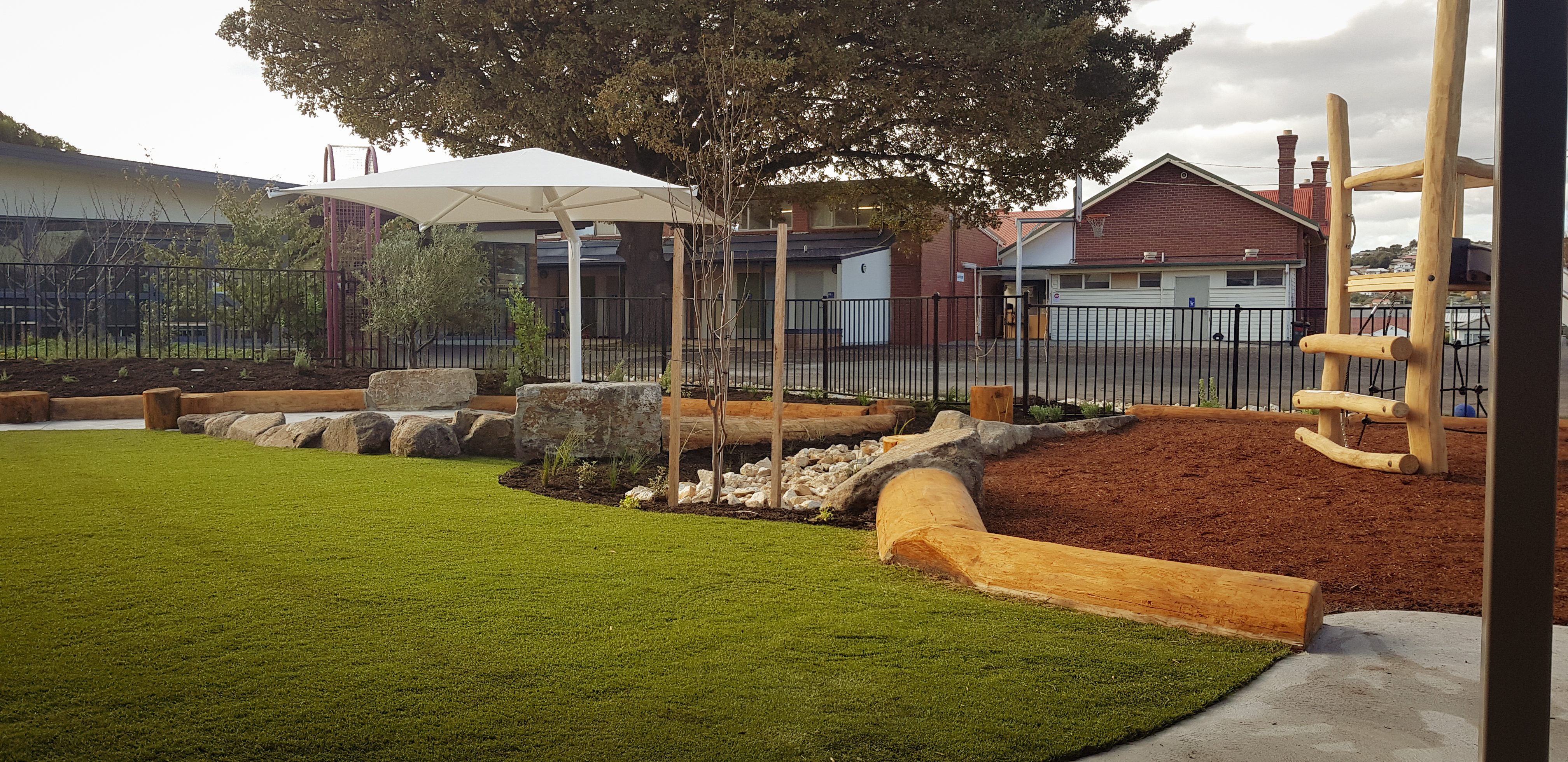 Synthetic grass, Kompan equipment, Dolerite boulders, eucalyptus logs, softfall sand and mulch, irrigation, Kings outdoor umbrella
