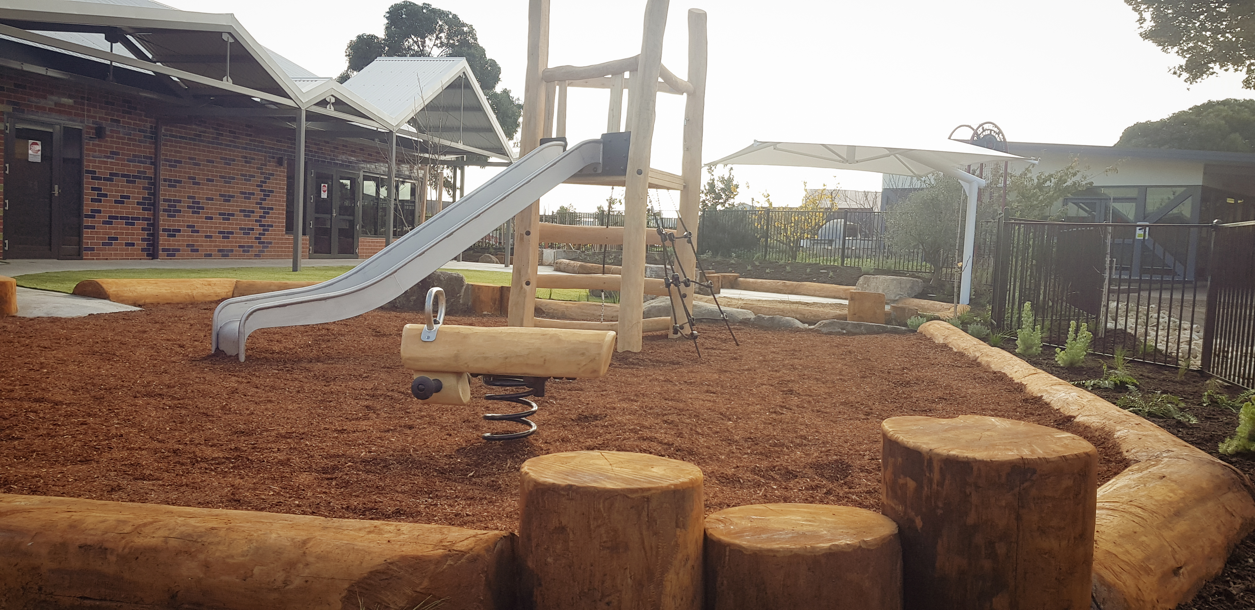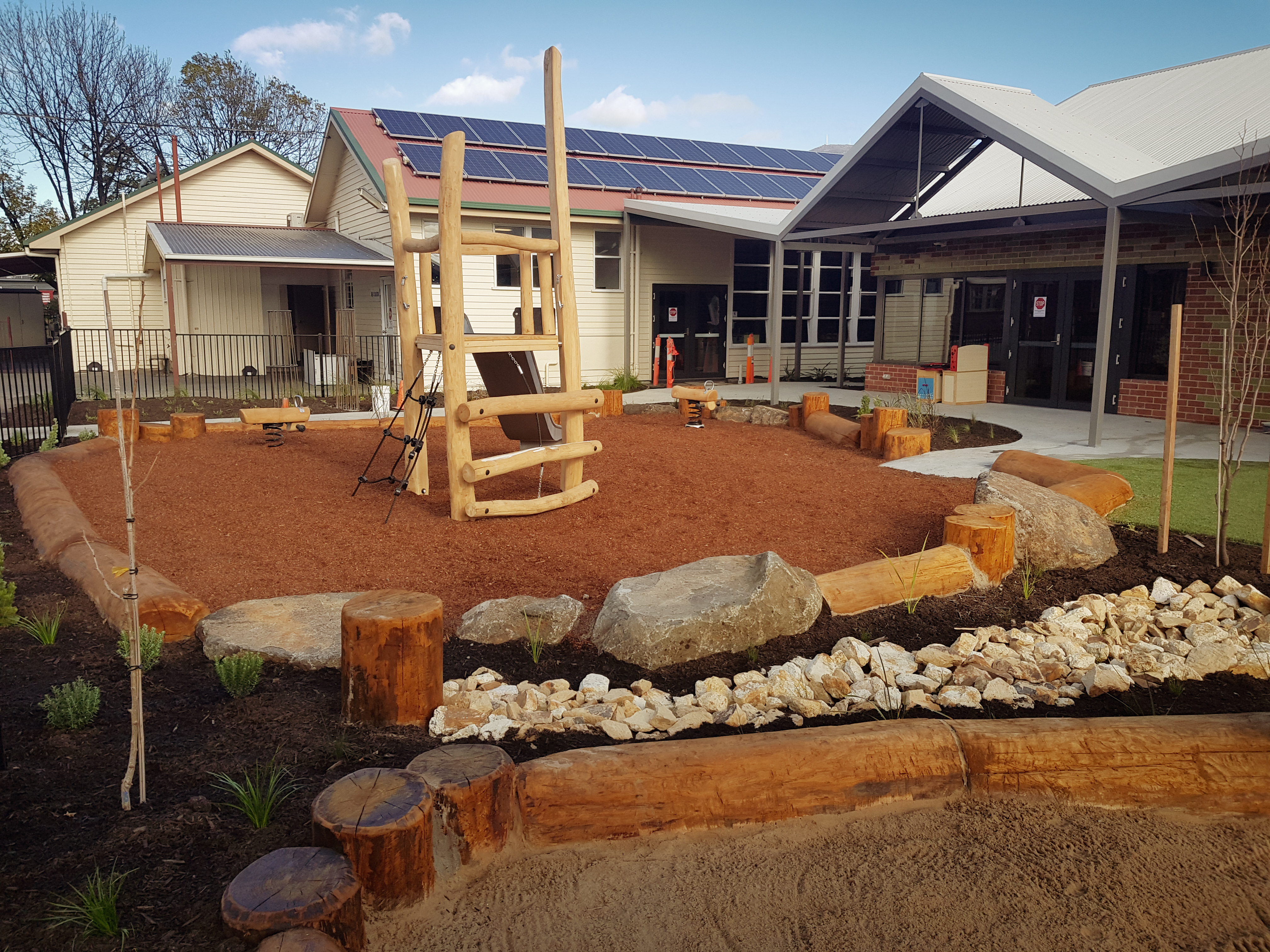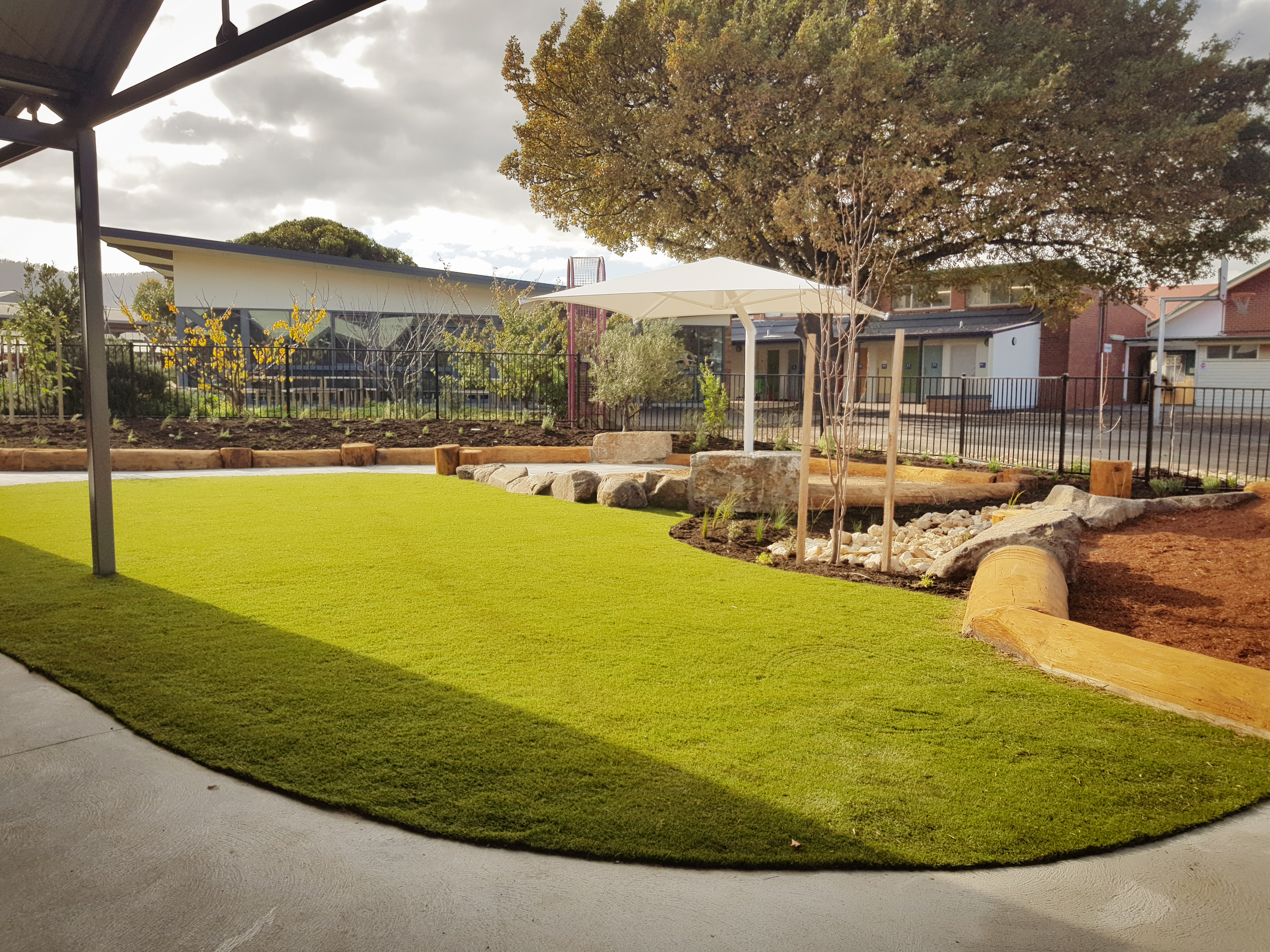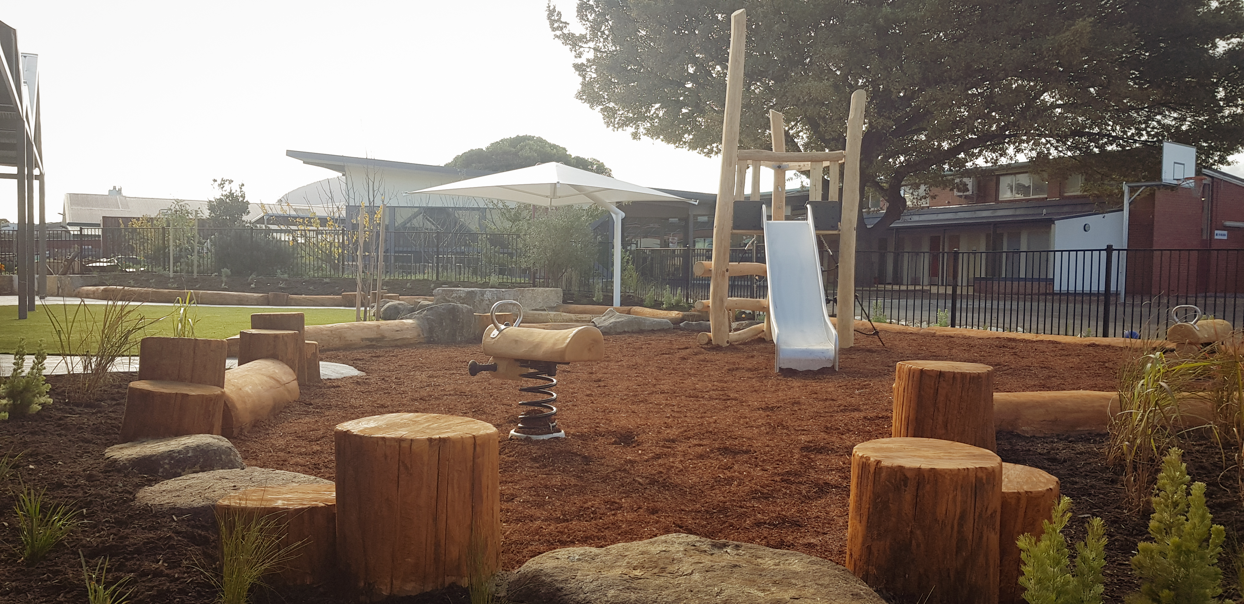 Synthetic grass, Kompan equipment, Dolerite boulders, eucalyptus logs, softfall sand and mulch, irrigation, Kings outdoor umbrella