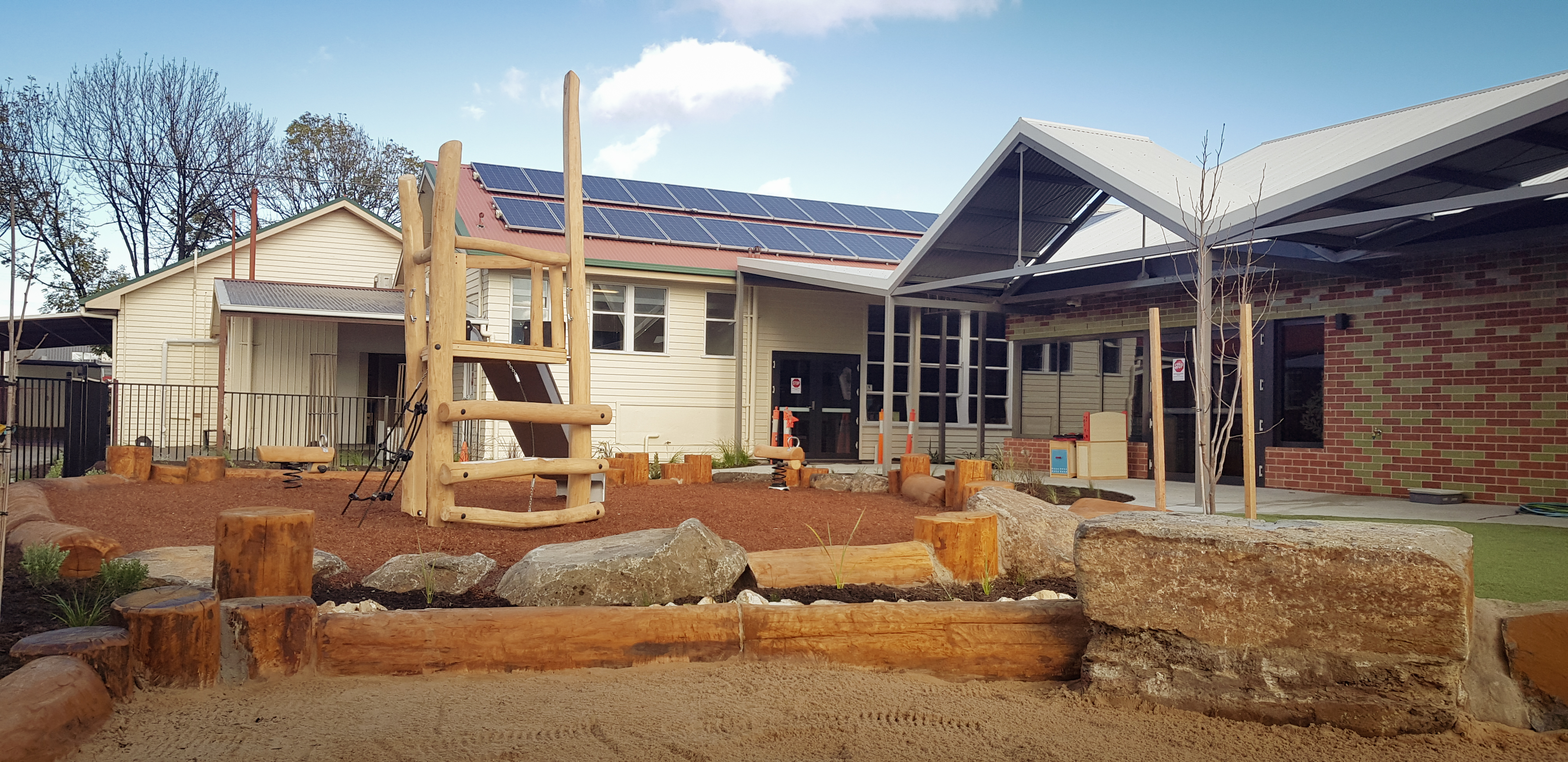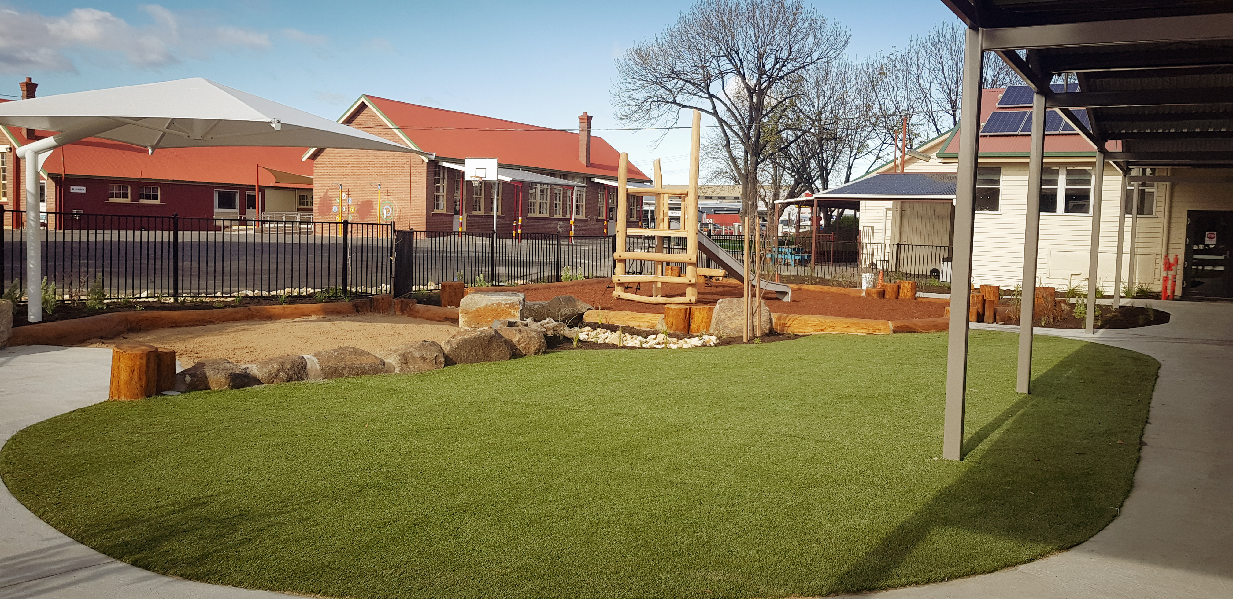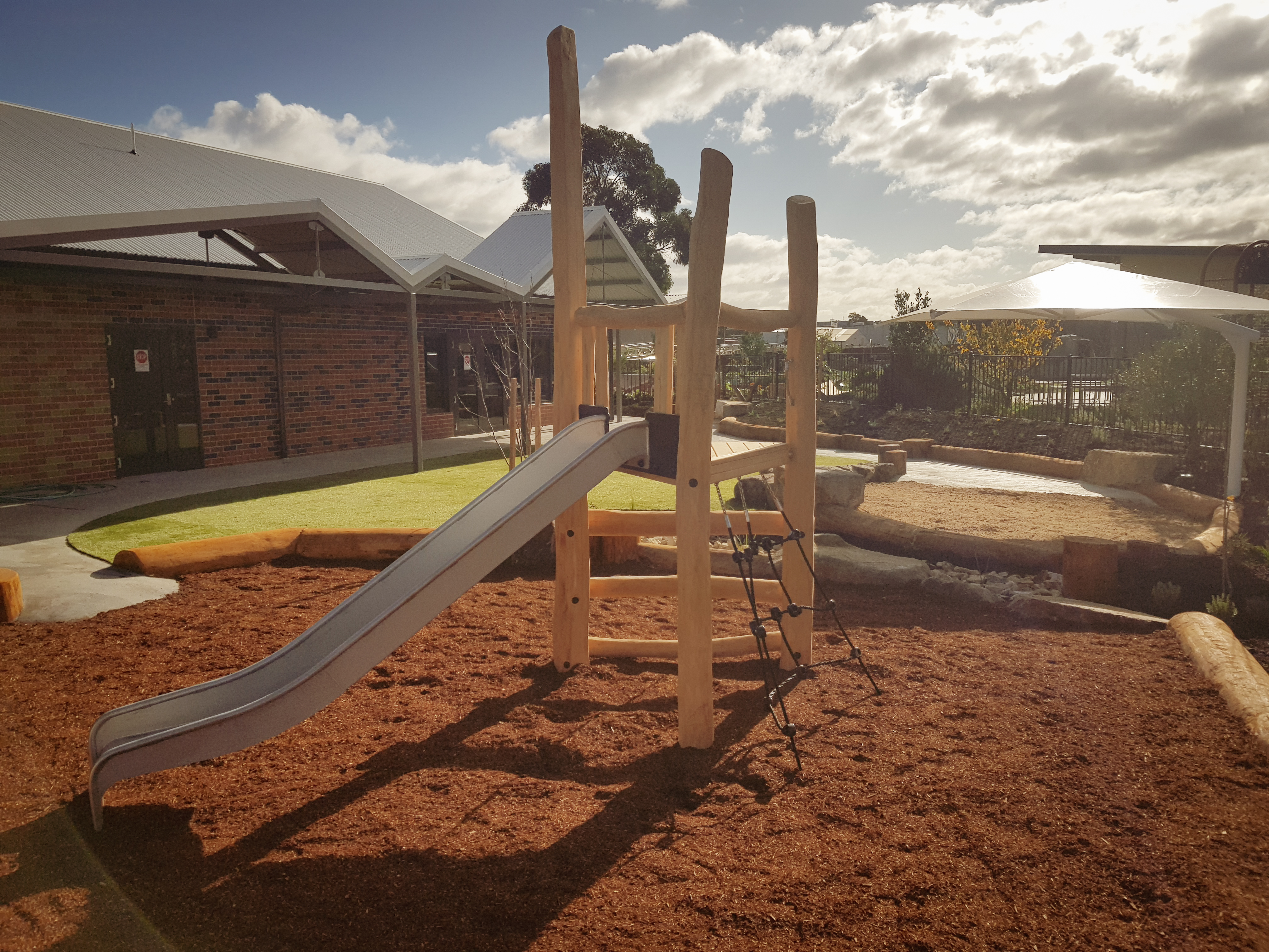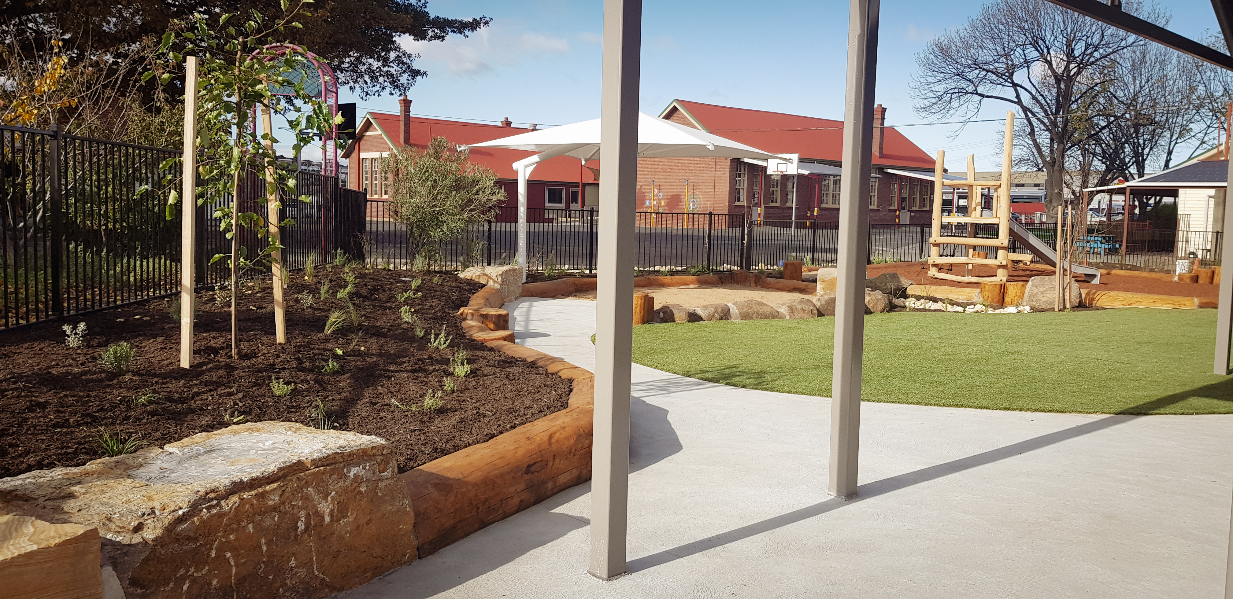 Synthetic grass, Kompan equipment, Dolerite boulders, eucalyptus logs, softfall sand and mulch, irrigation, Kings outdoor umbrella