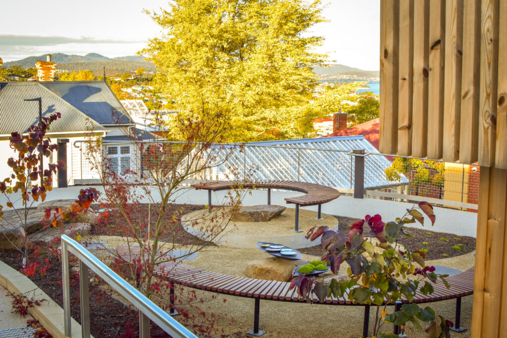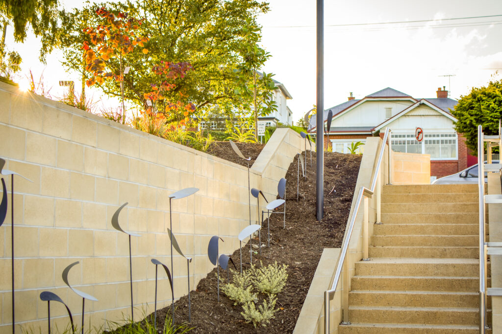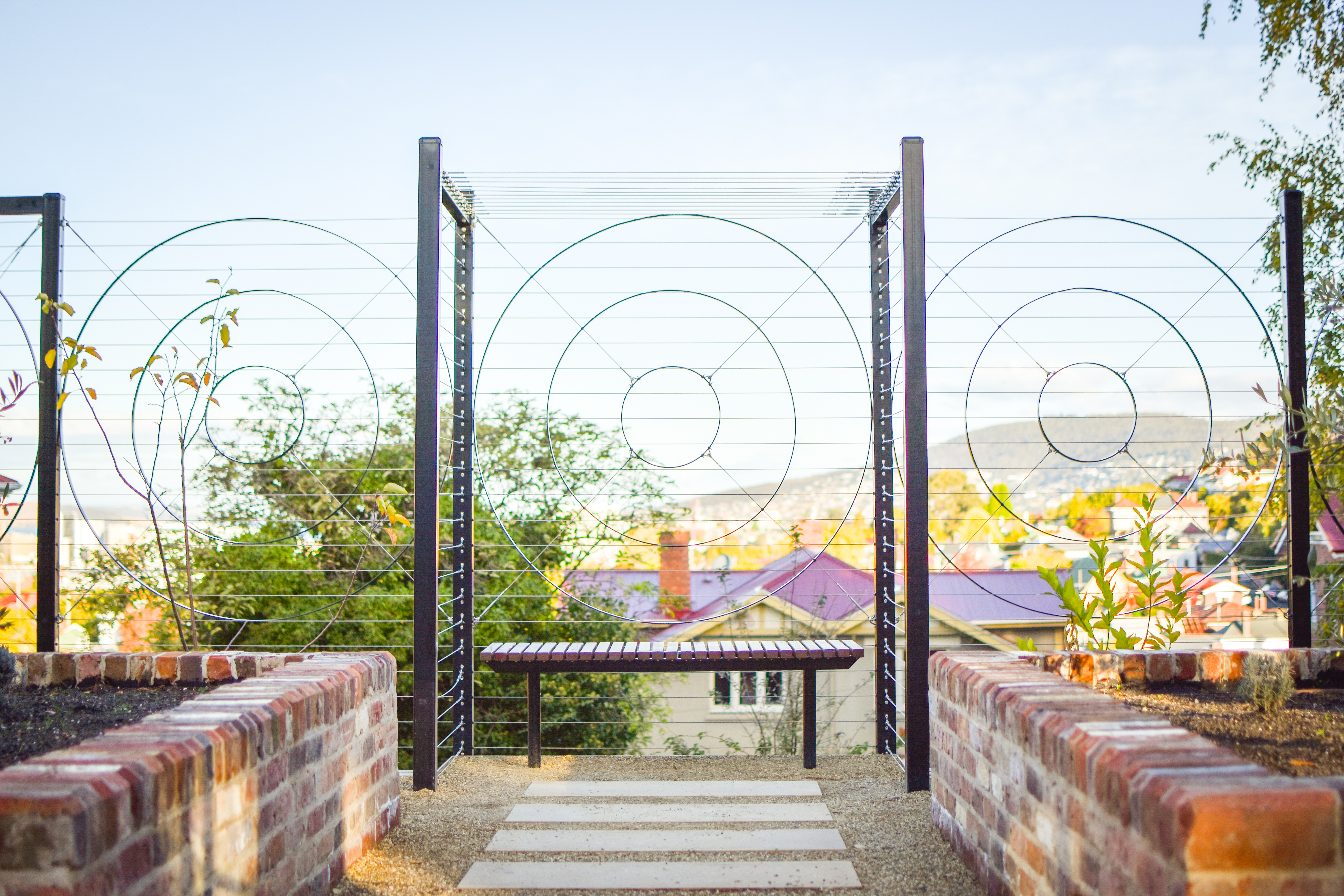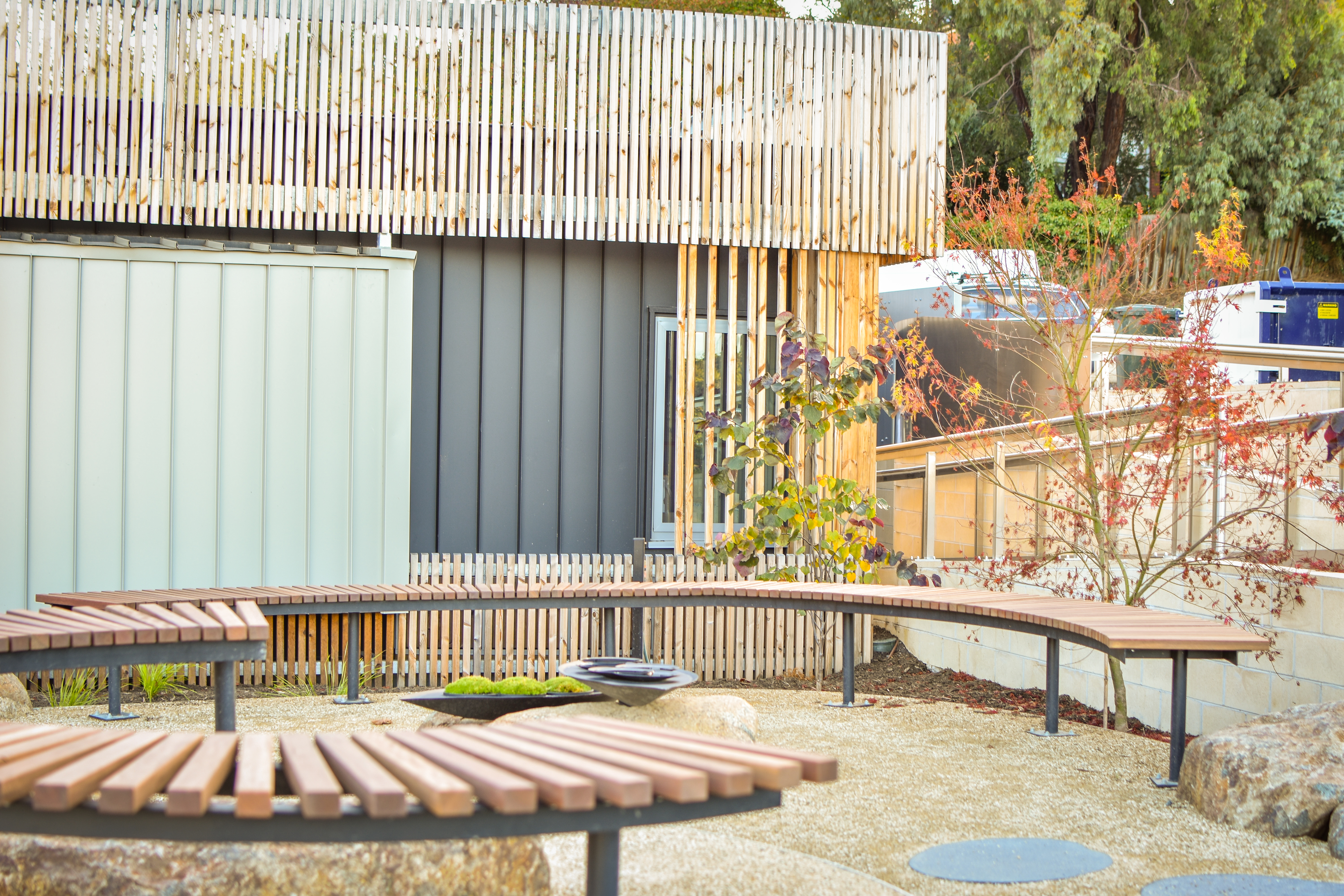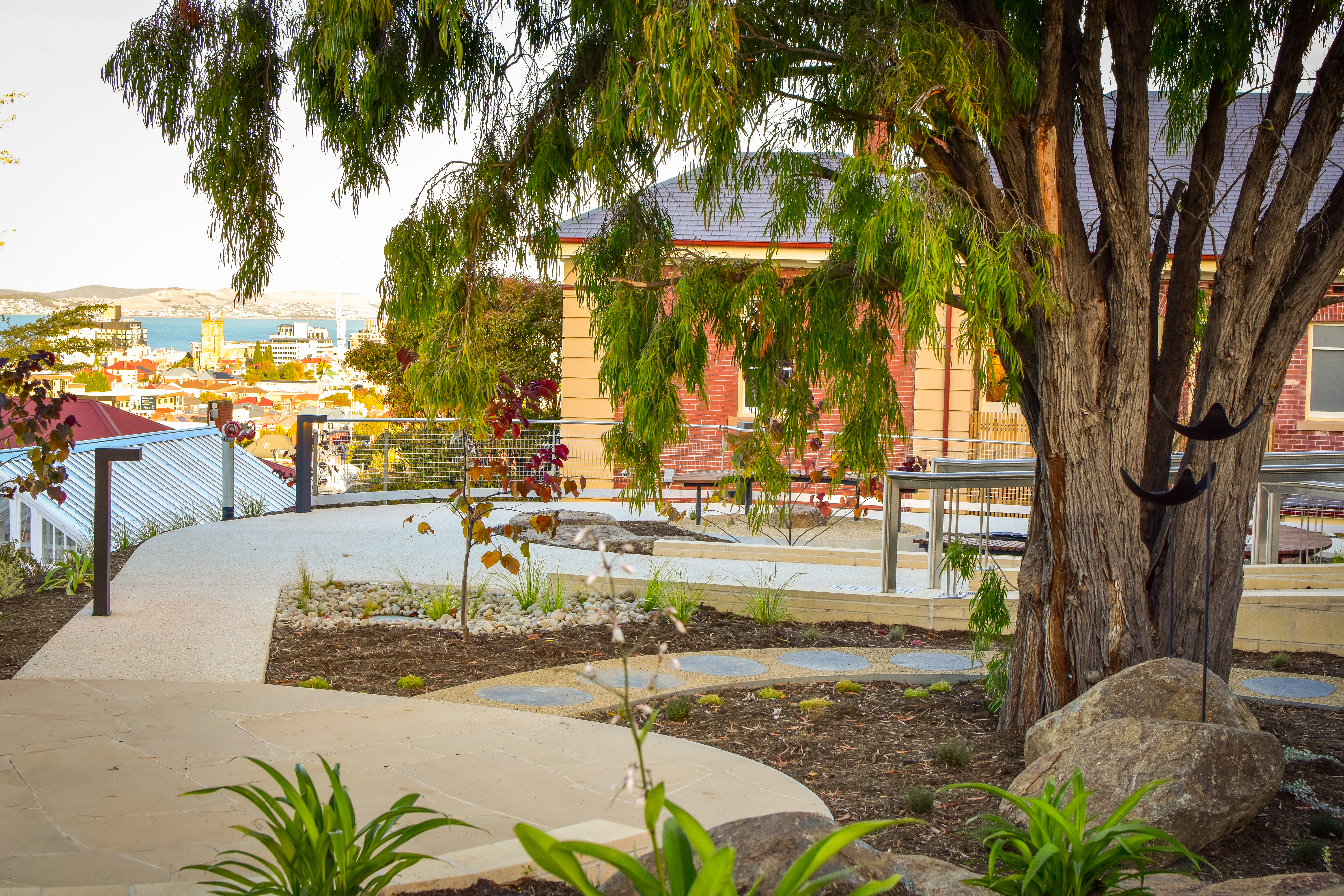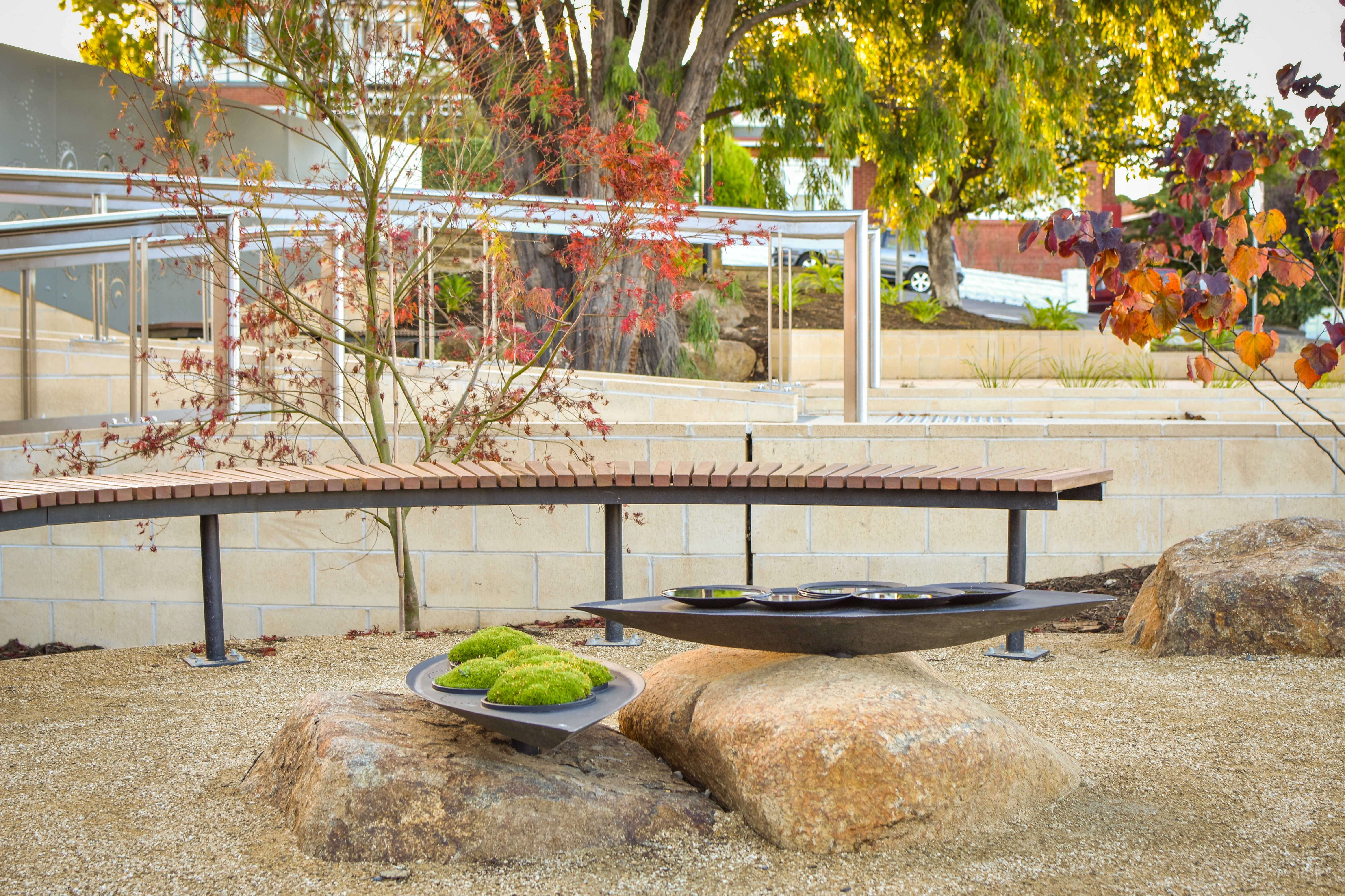 Hansons concrete ‘Derwent Mix’, Stoneworld black limestone steppers, Heritage Stone sandstone crazy paving & steppers, galvanised steel edging, straightcurve weathered steel edging, dolerite boulders, custom bench seats