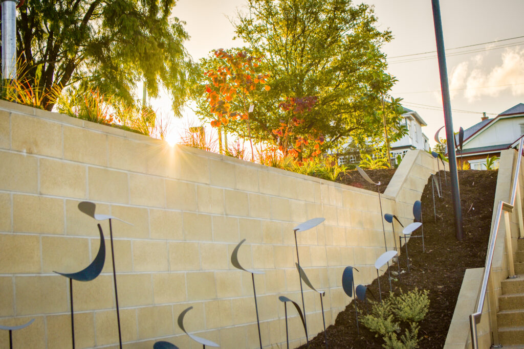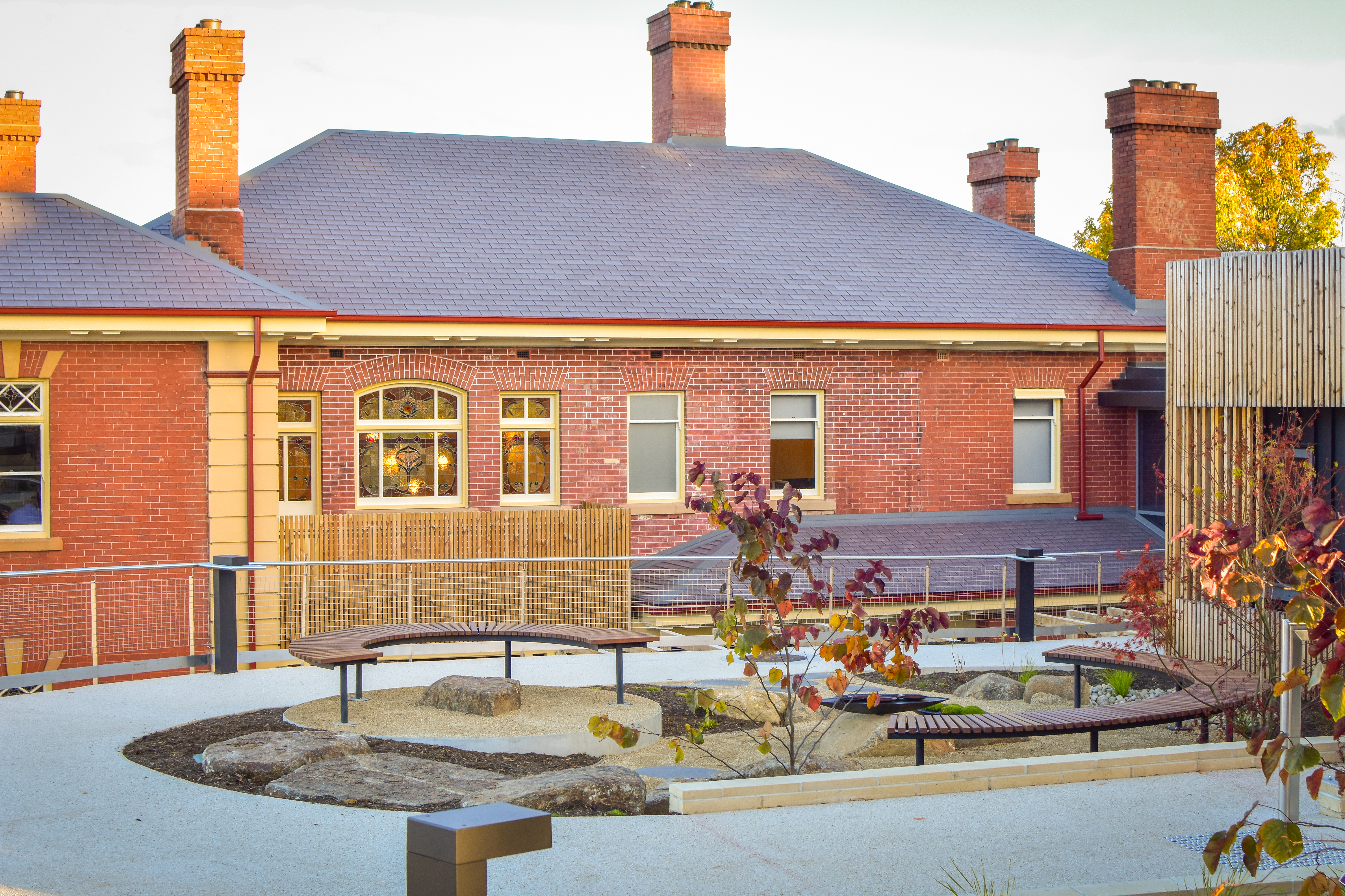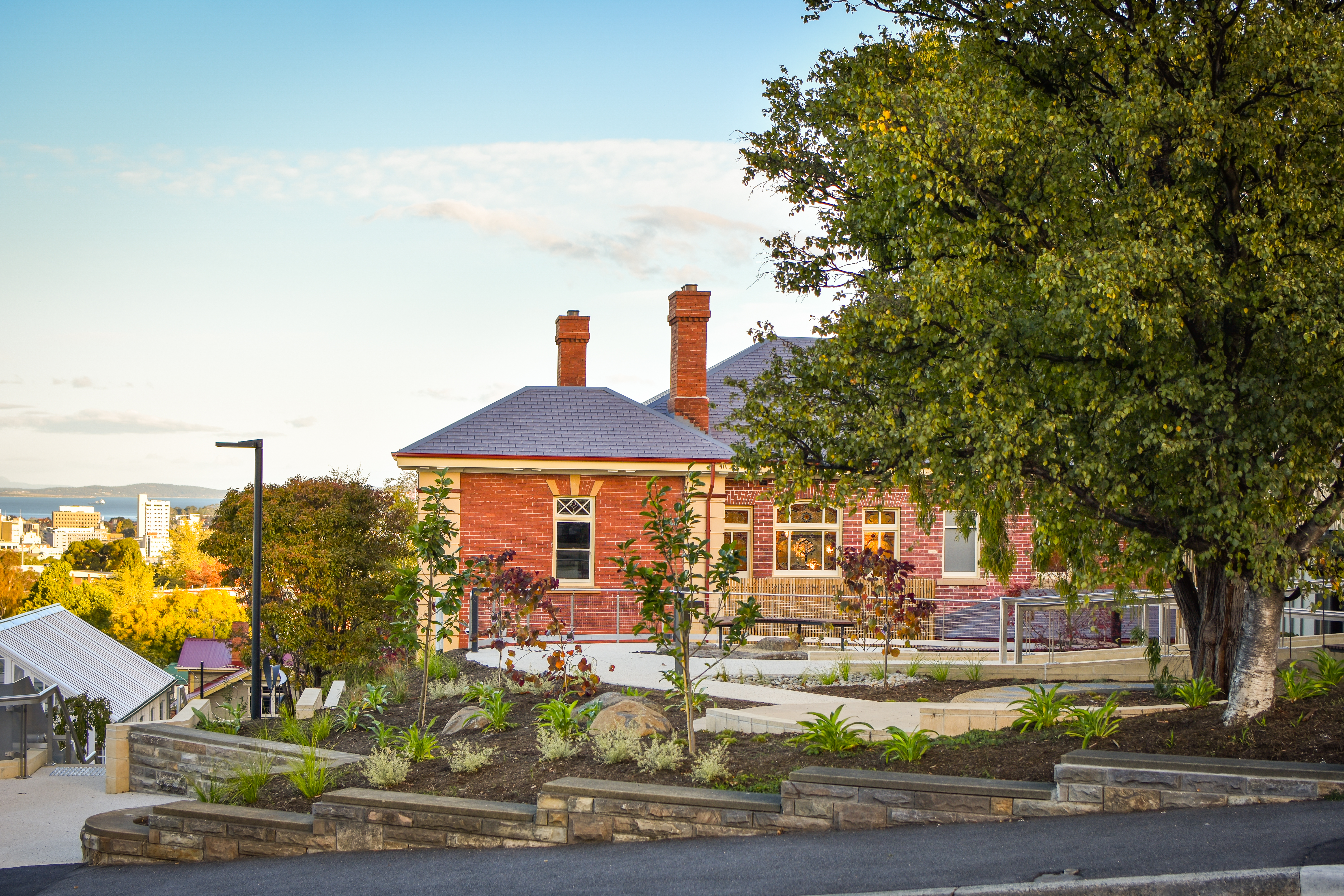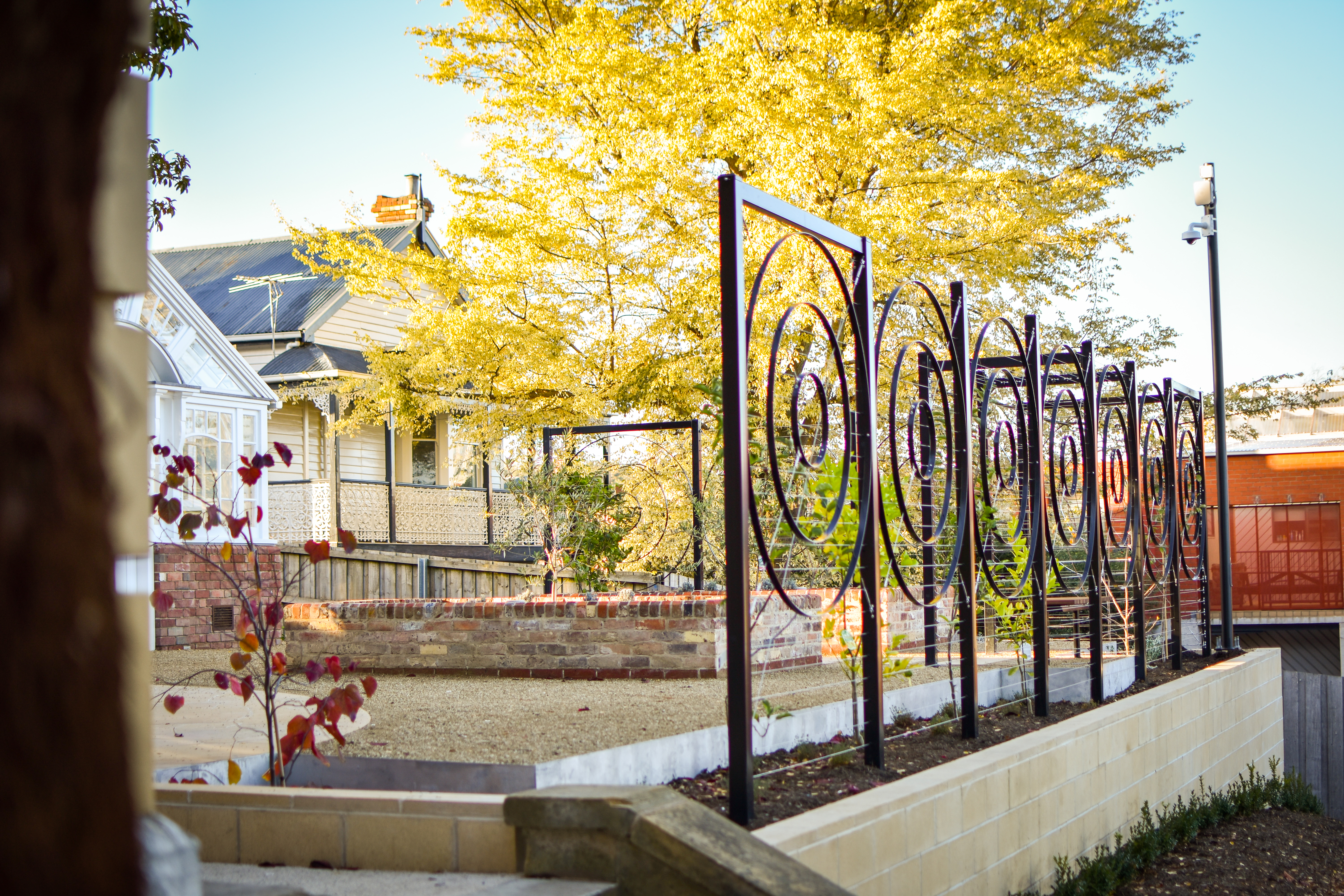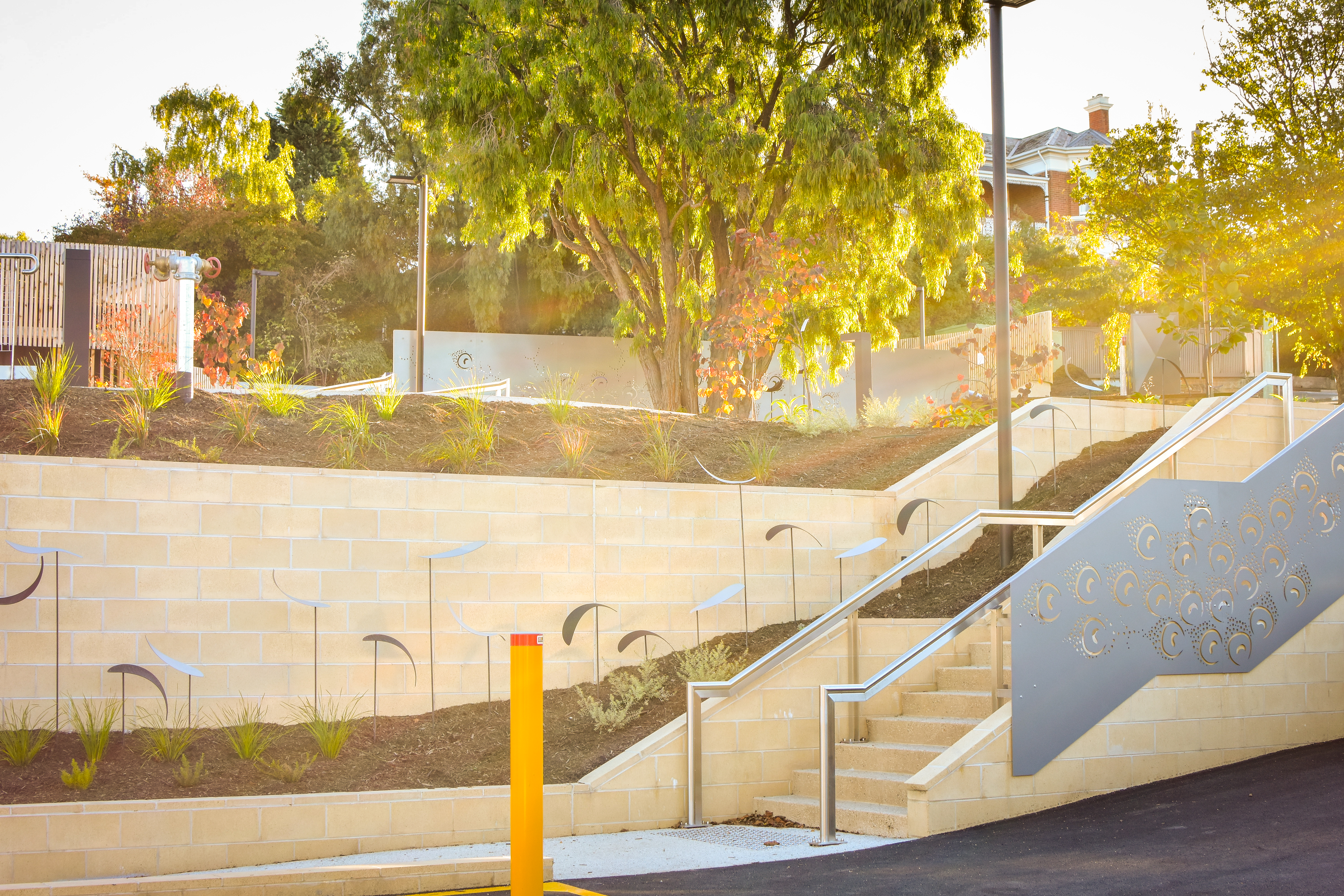 Hansons concrete ‘Derwent Mix’, Stoneworld black limestone steppers, Heritage Stone sandstone crazy paving & steppers, galvanised steel edging, straightcurve weathered steel edging, dolerite boulders, custom bench seats