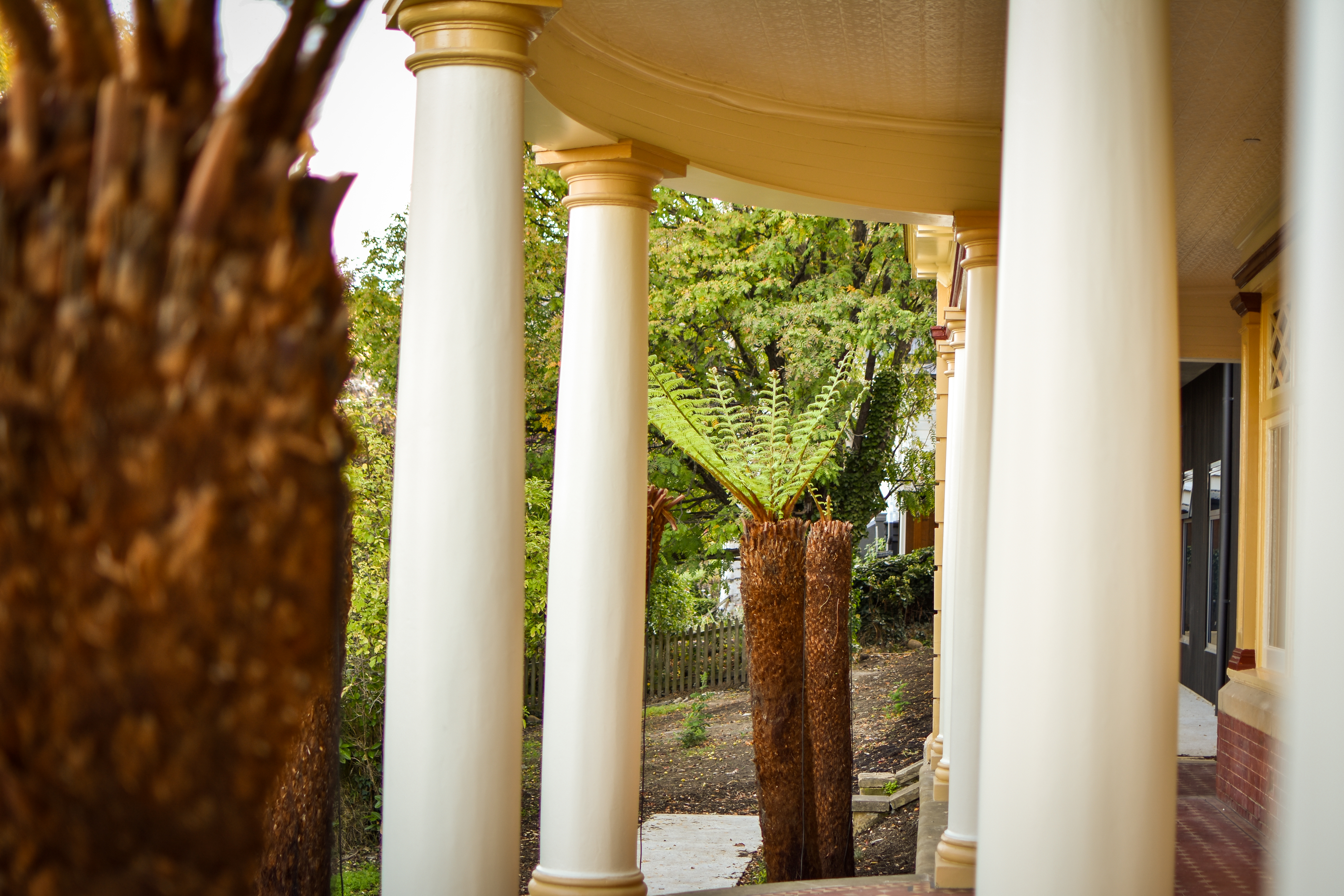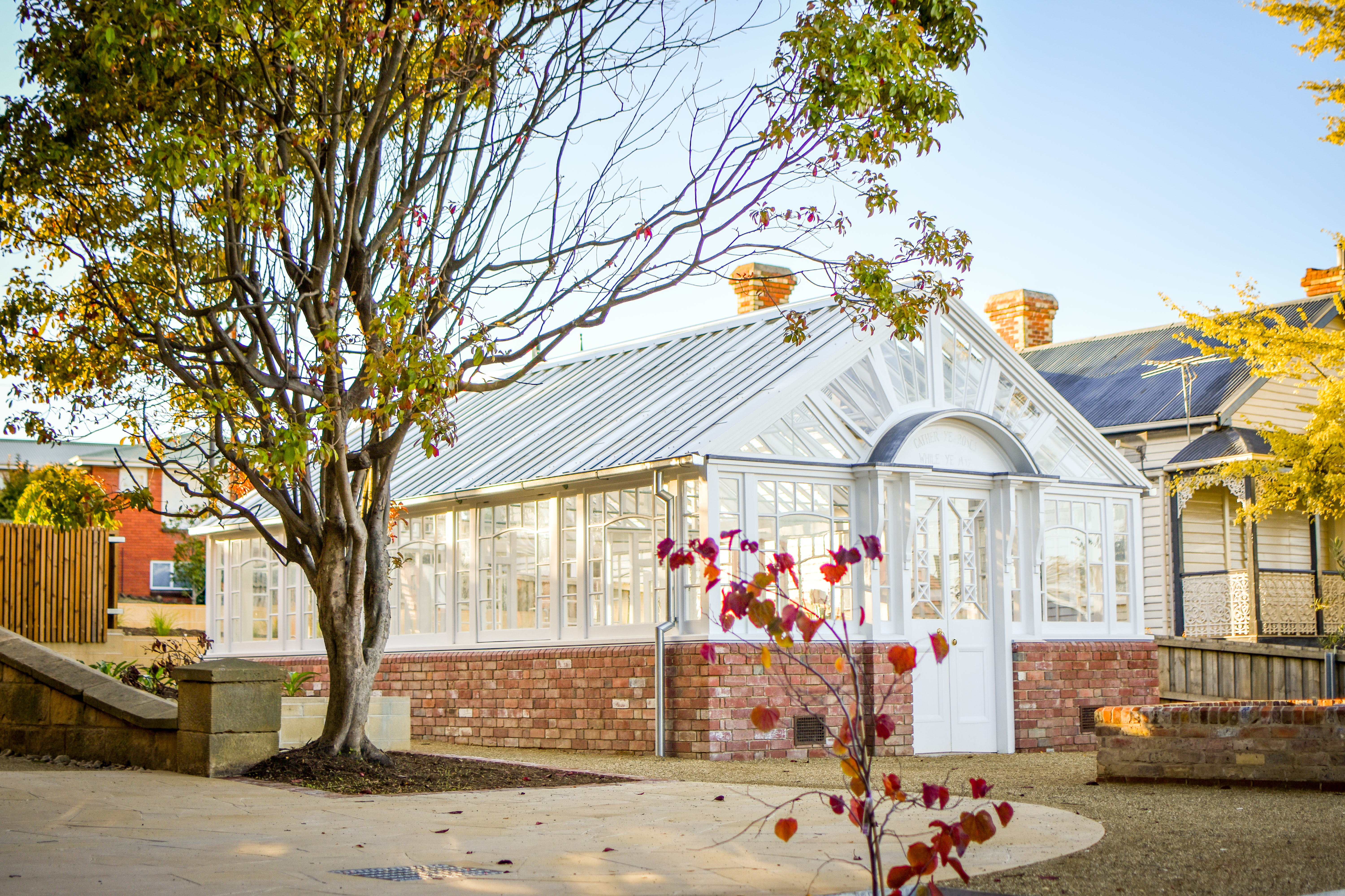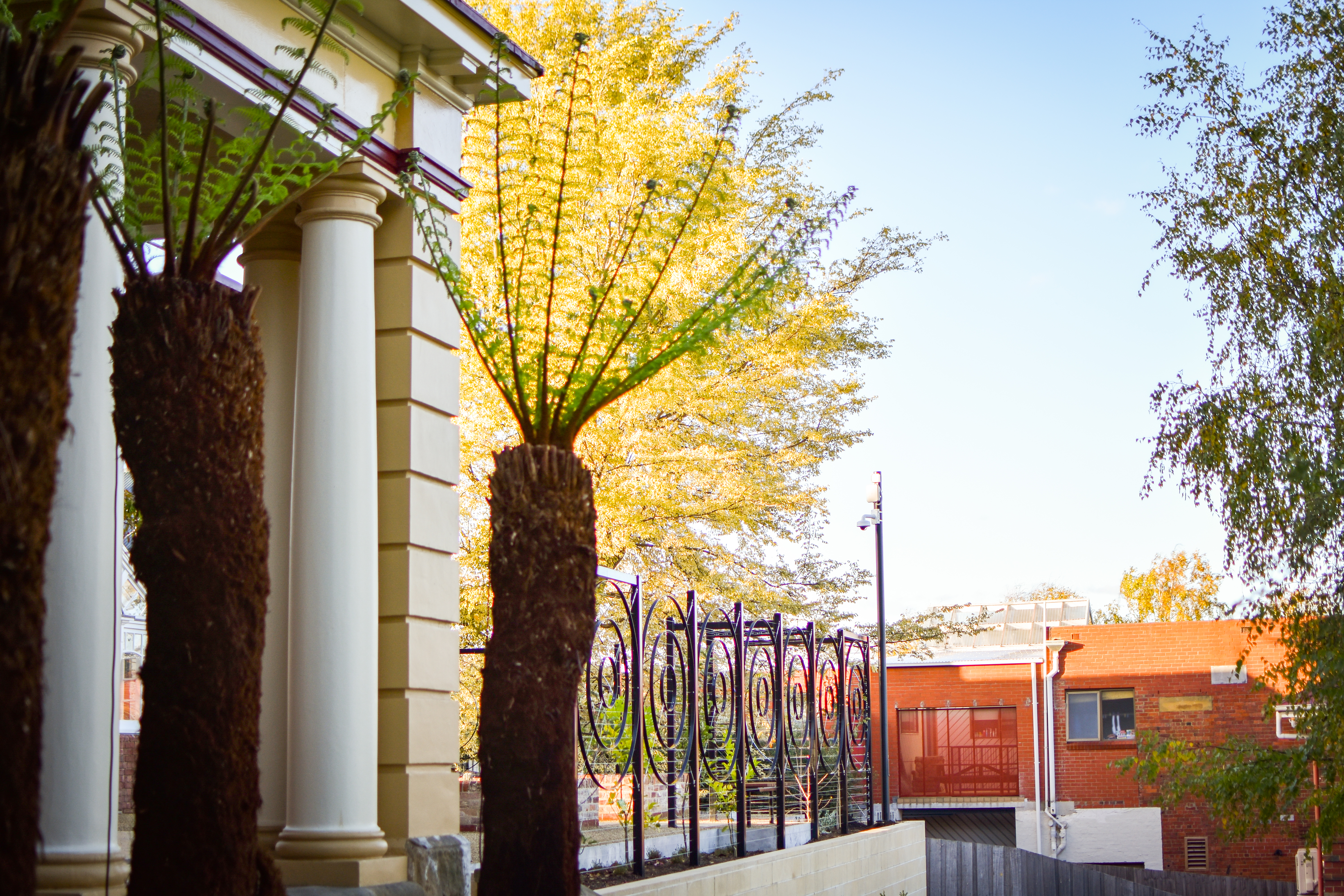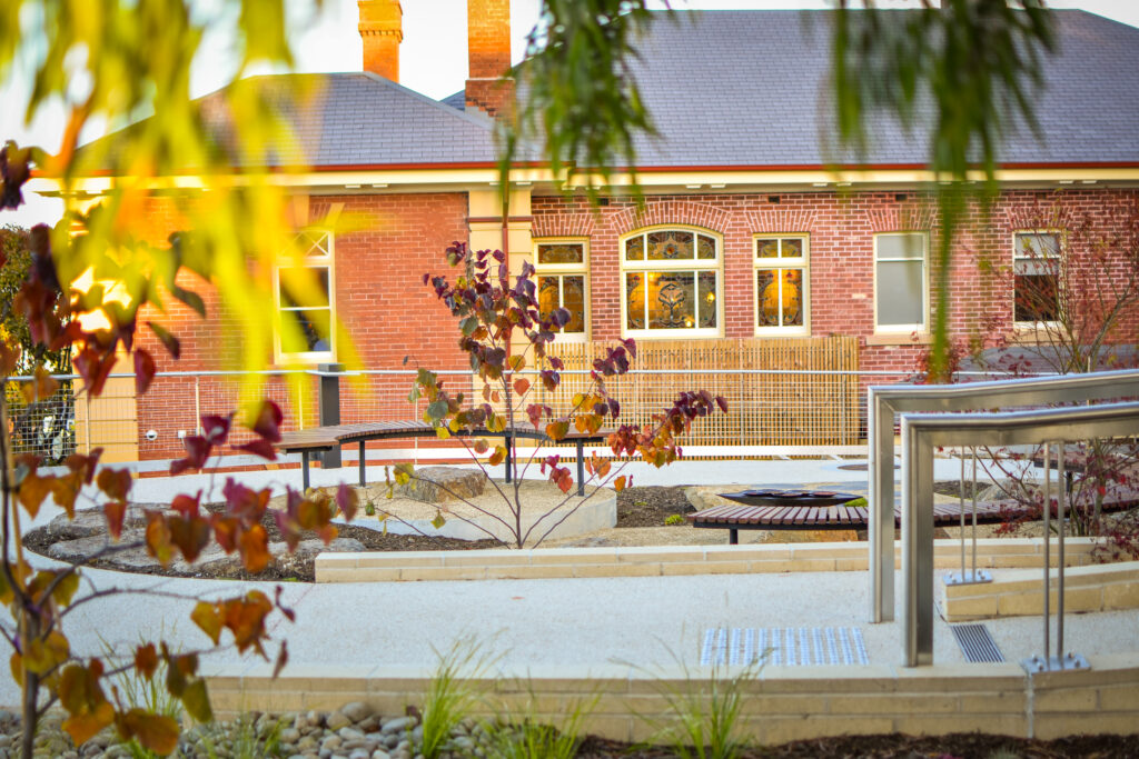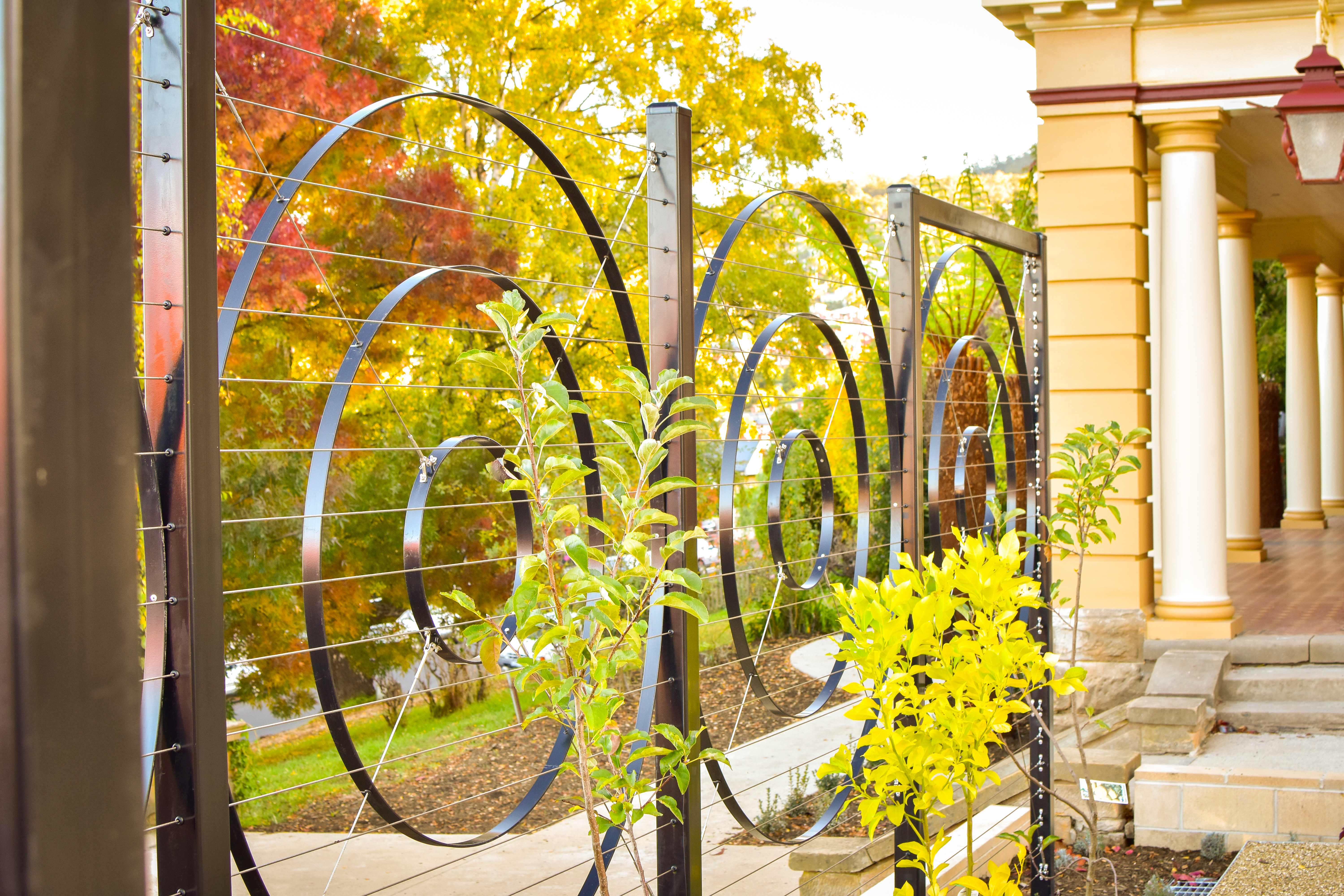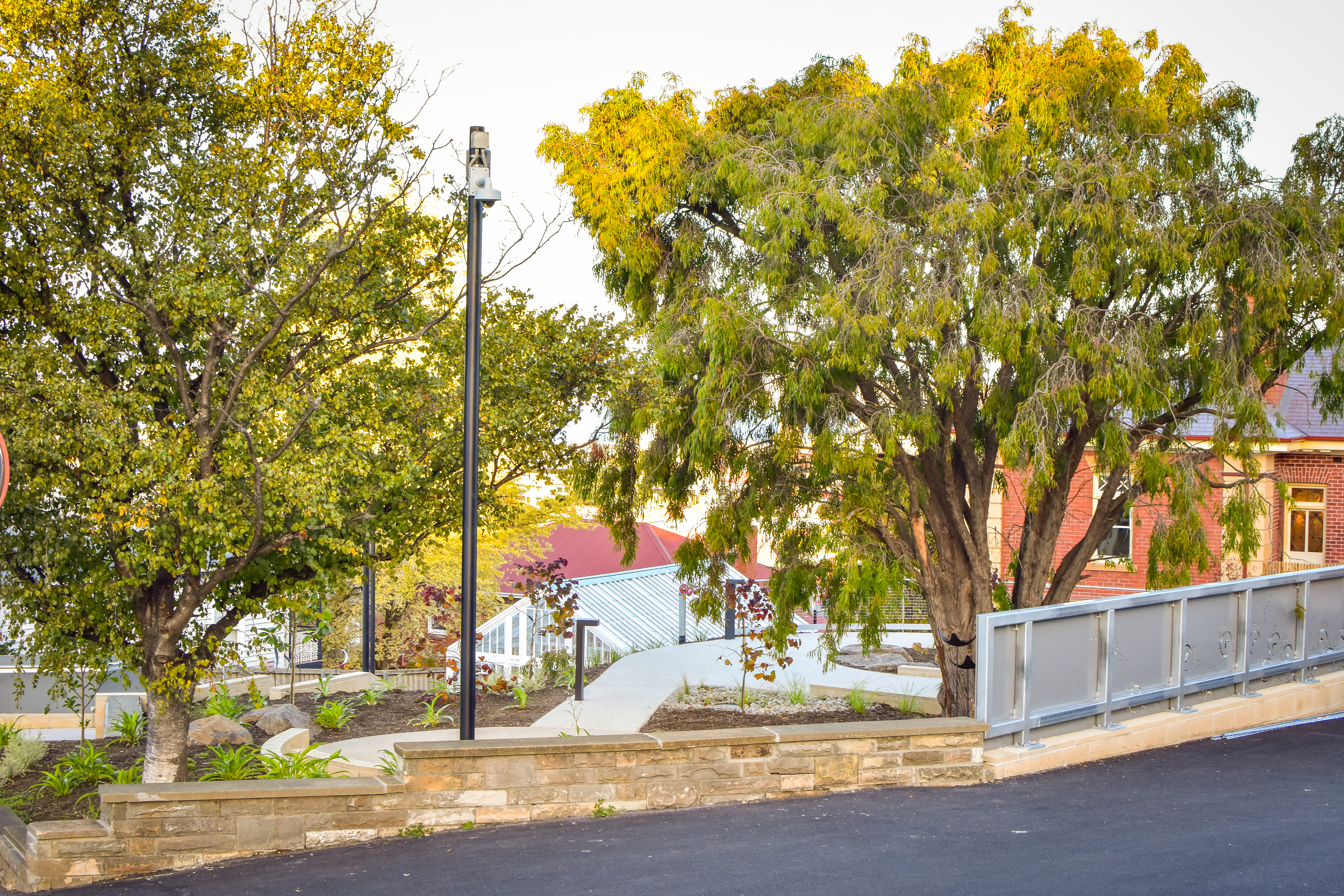 Hansons concrete ‘Derwent Mix’, Stoneworld black limestone steppers, Heritage Stone sandstone crazy paving & steppers, galvanised steel edging, straightcurve weathered steel edging, dolerite boulders, custom bench seats