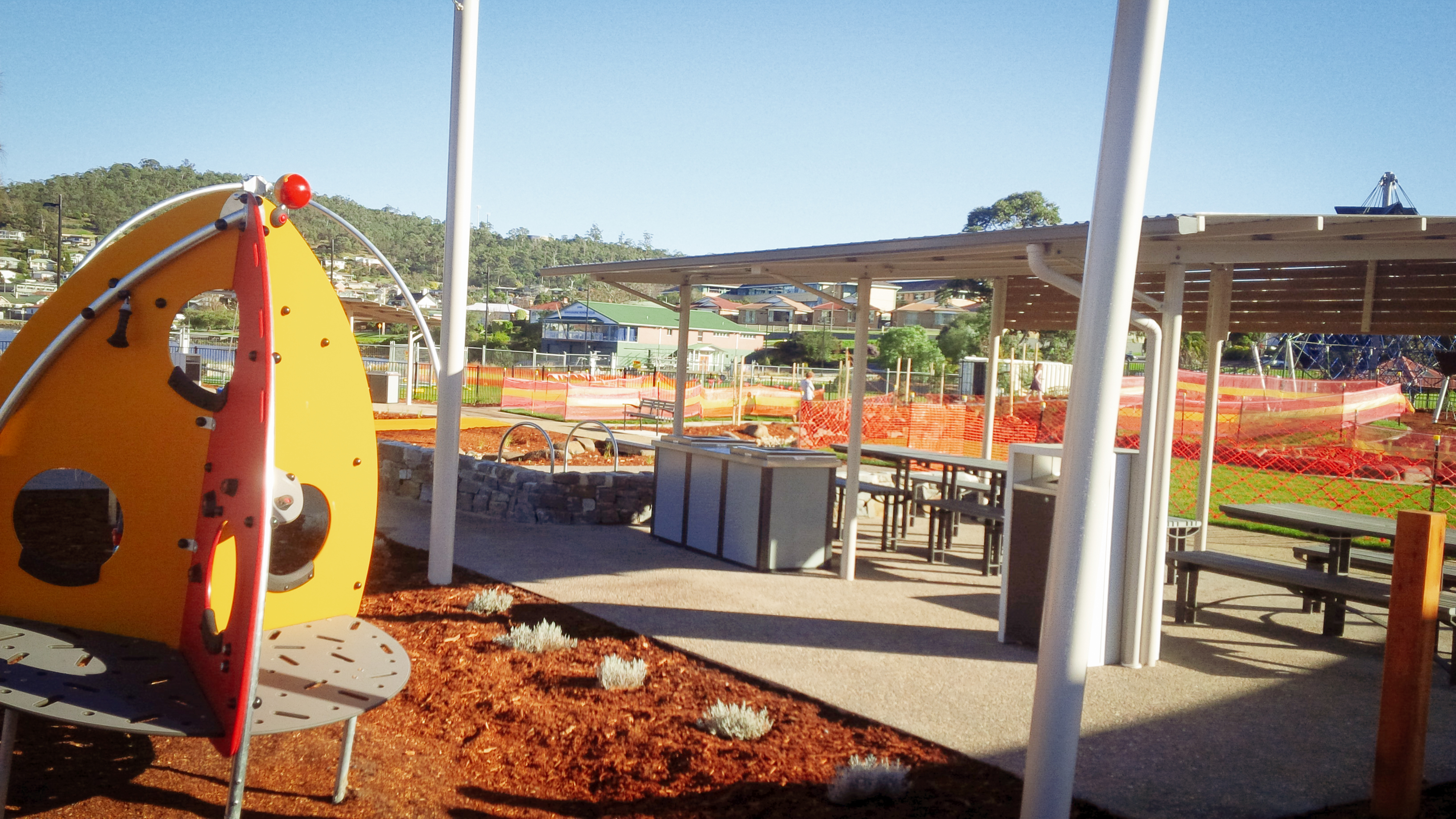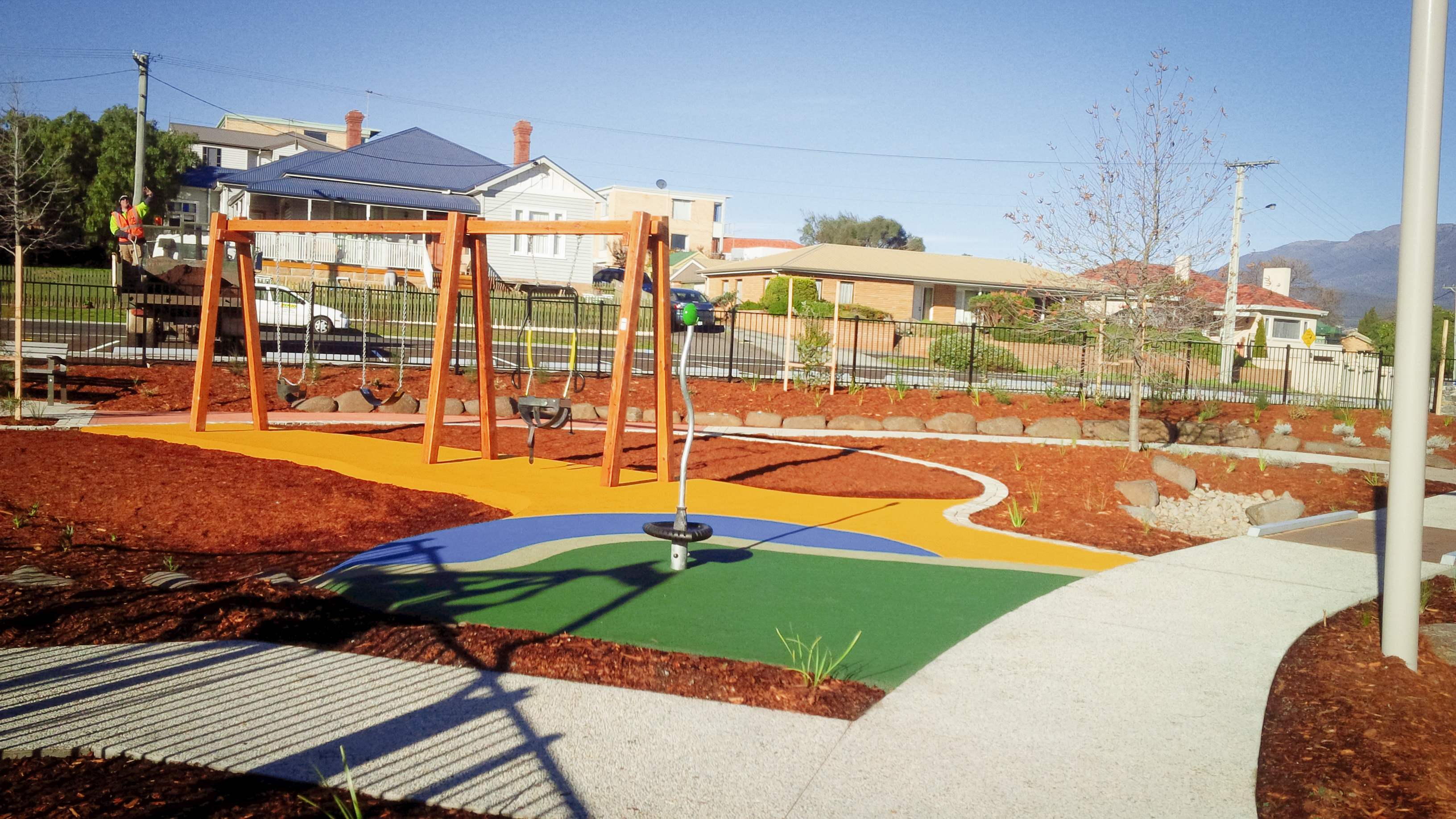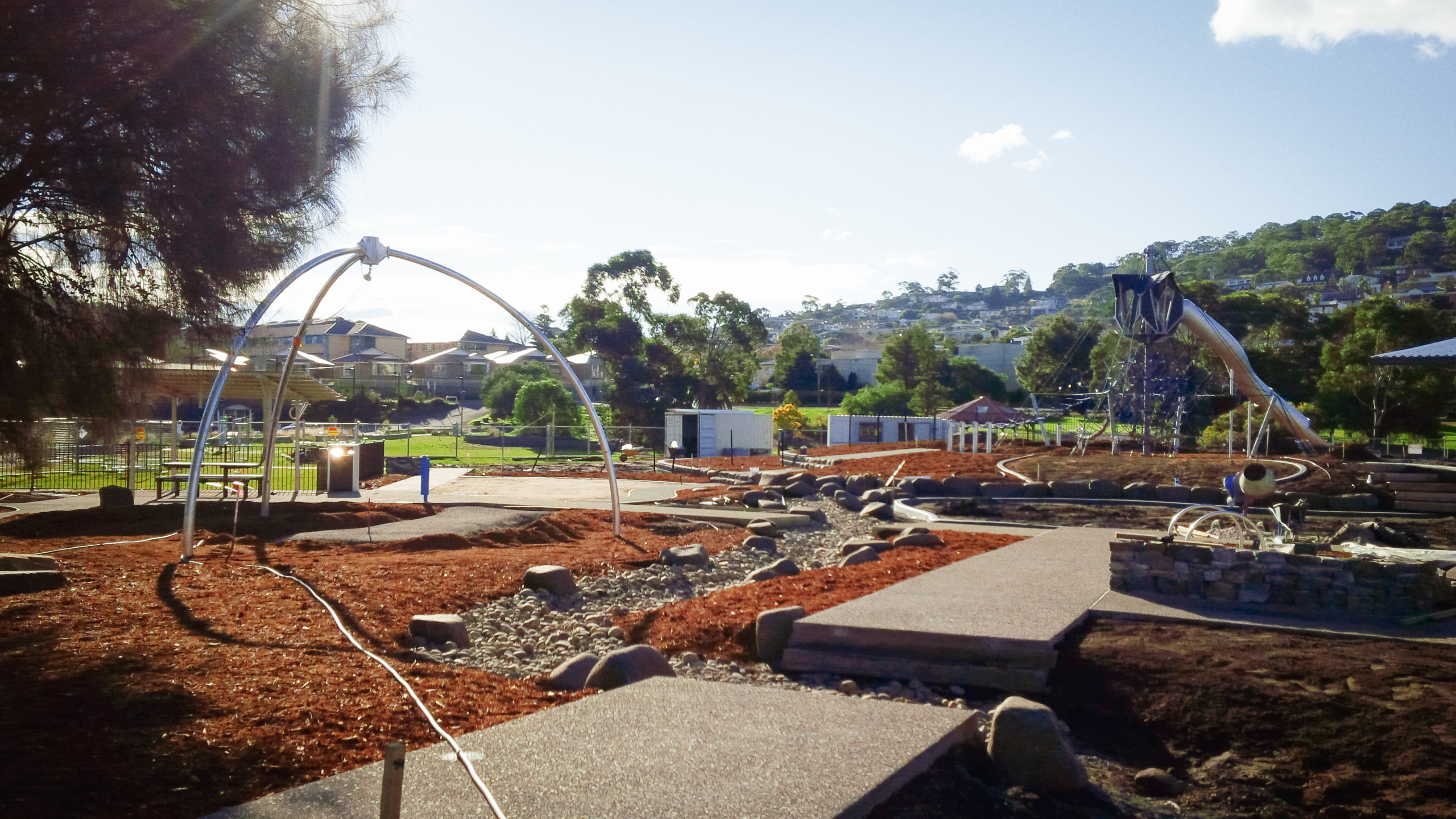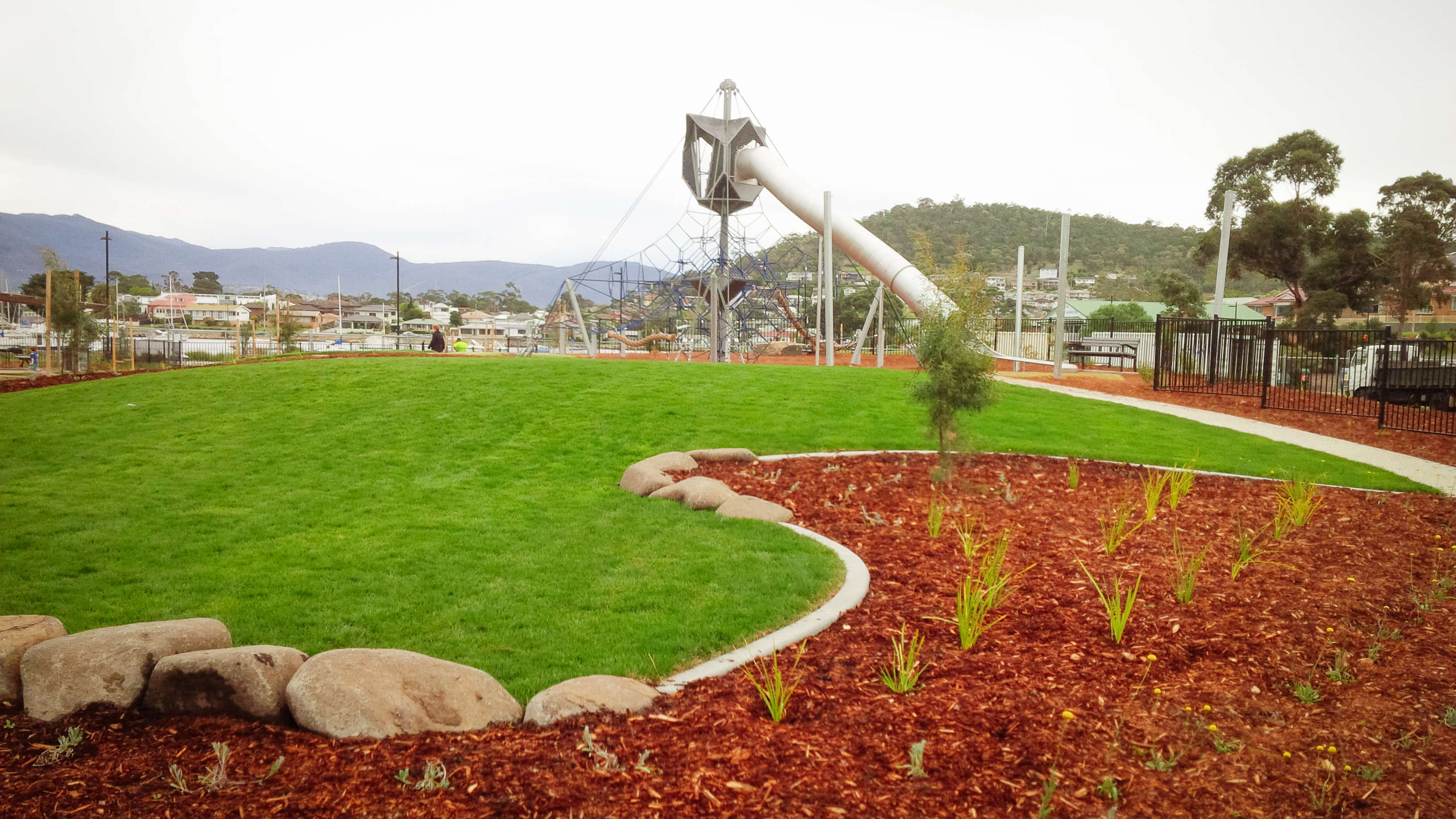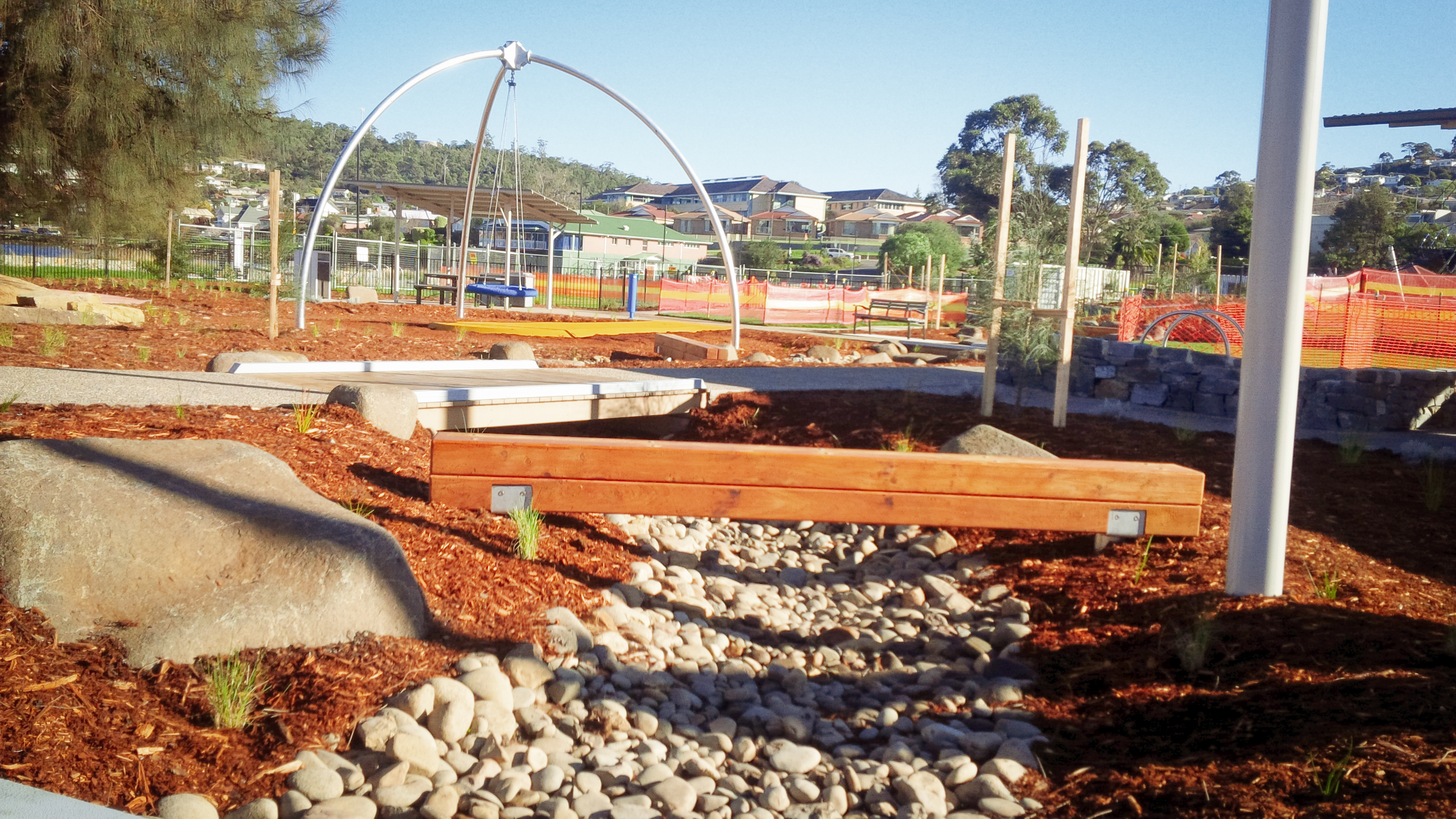 Kompan play equipment, instant turf, rubber softfall, Dolerite boulders, exposed aggregate and coloured concrete