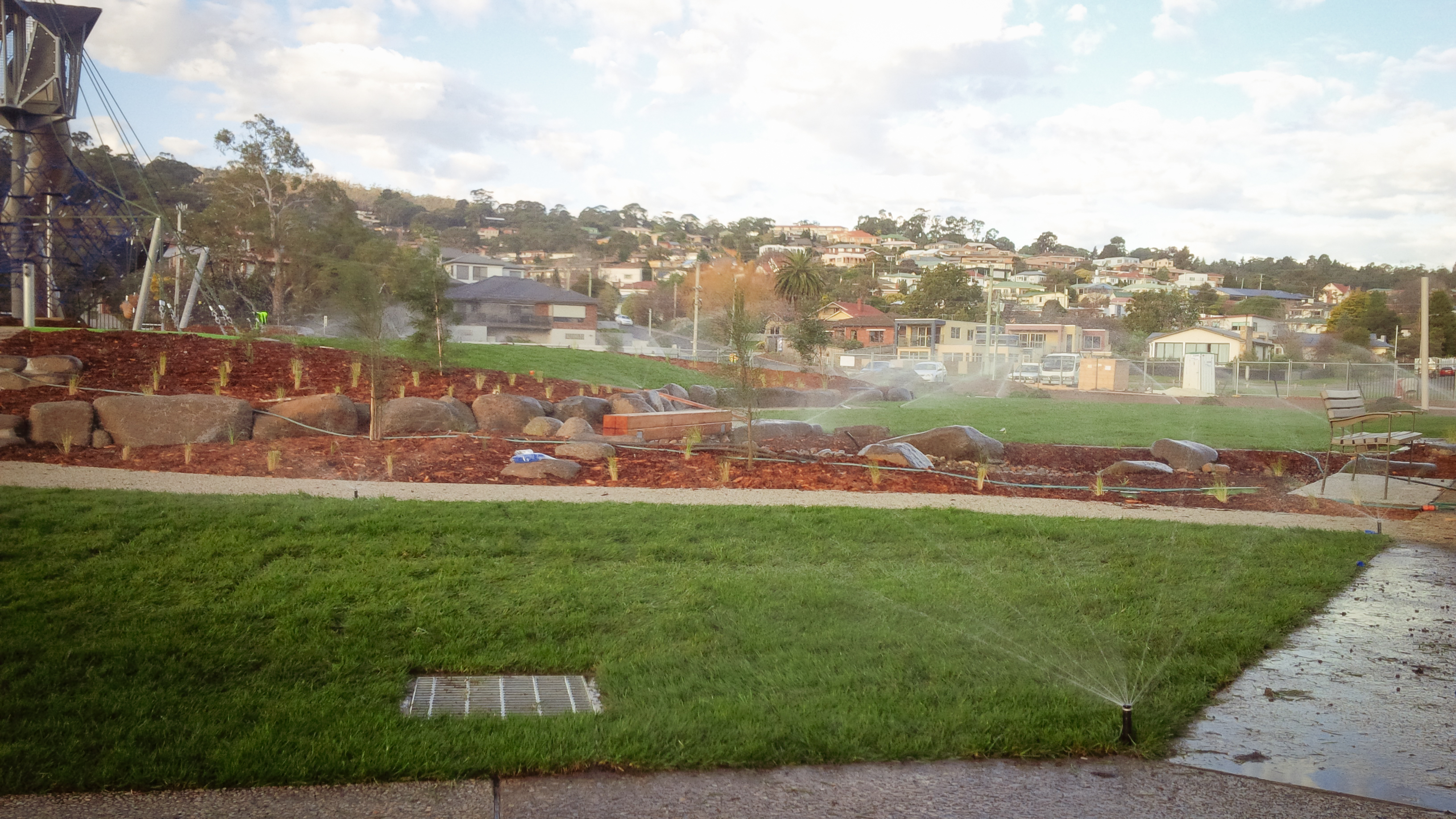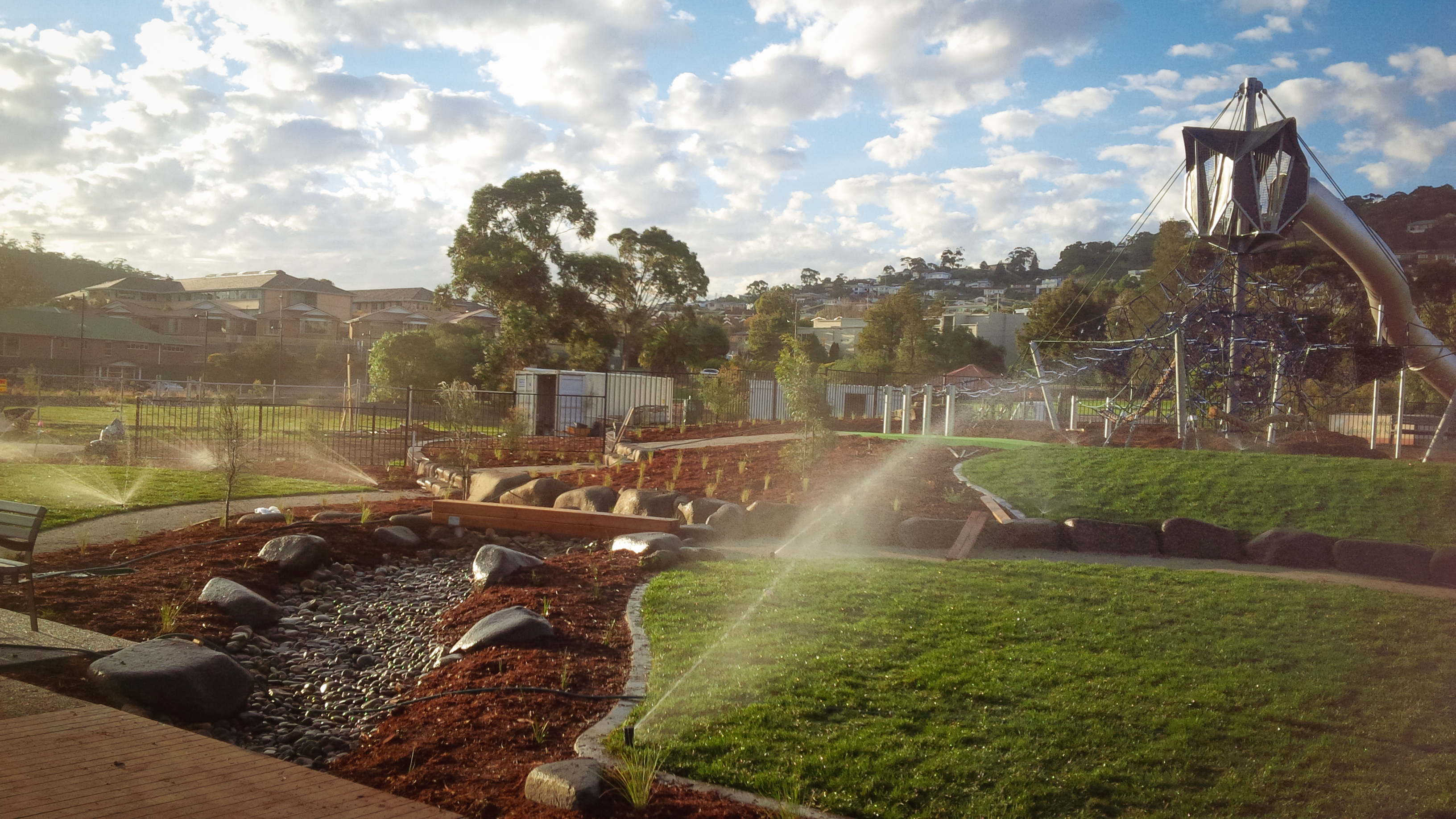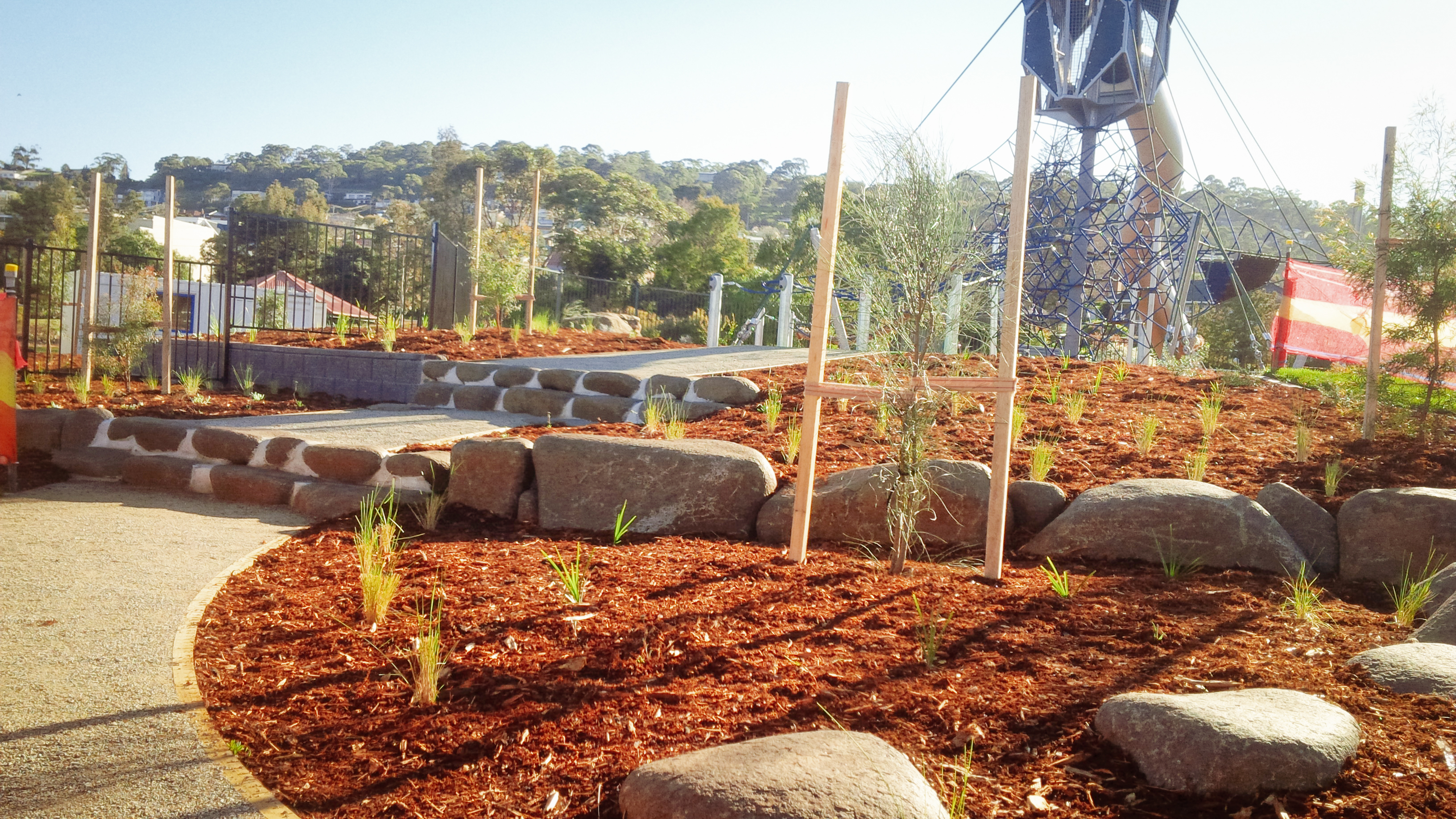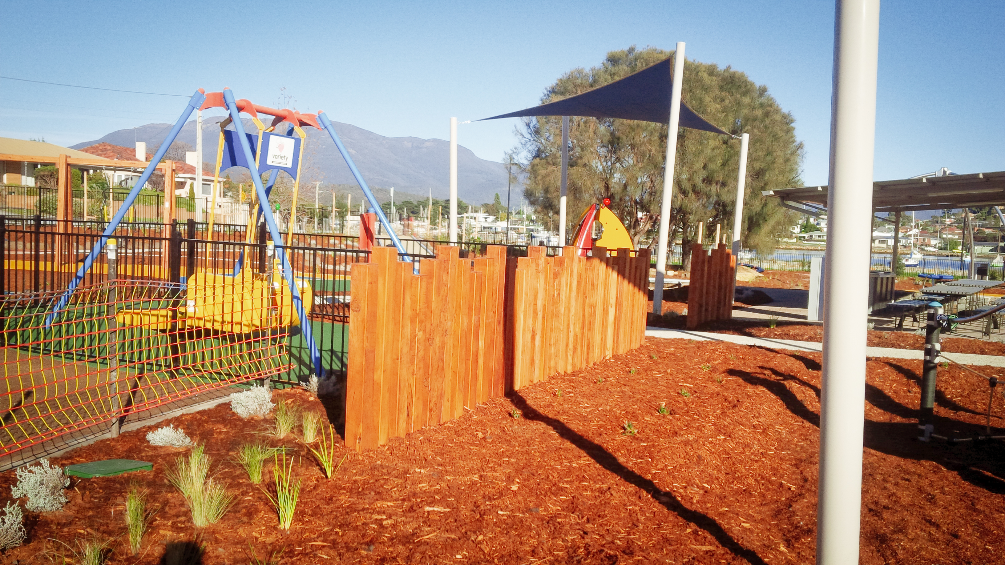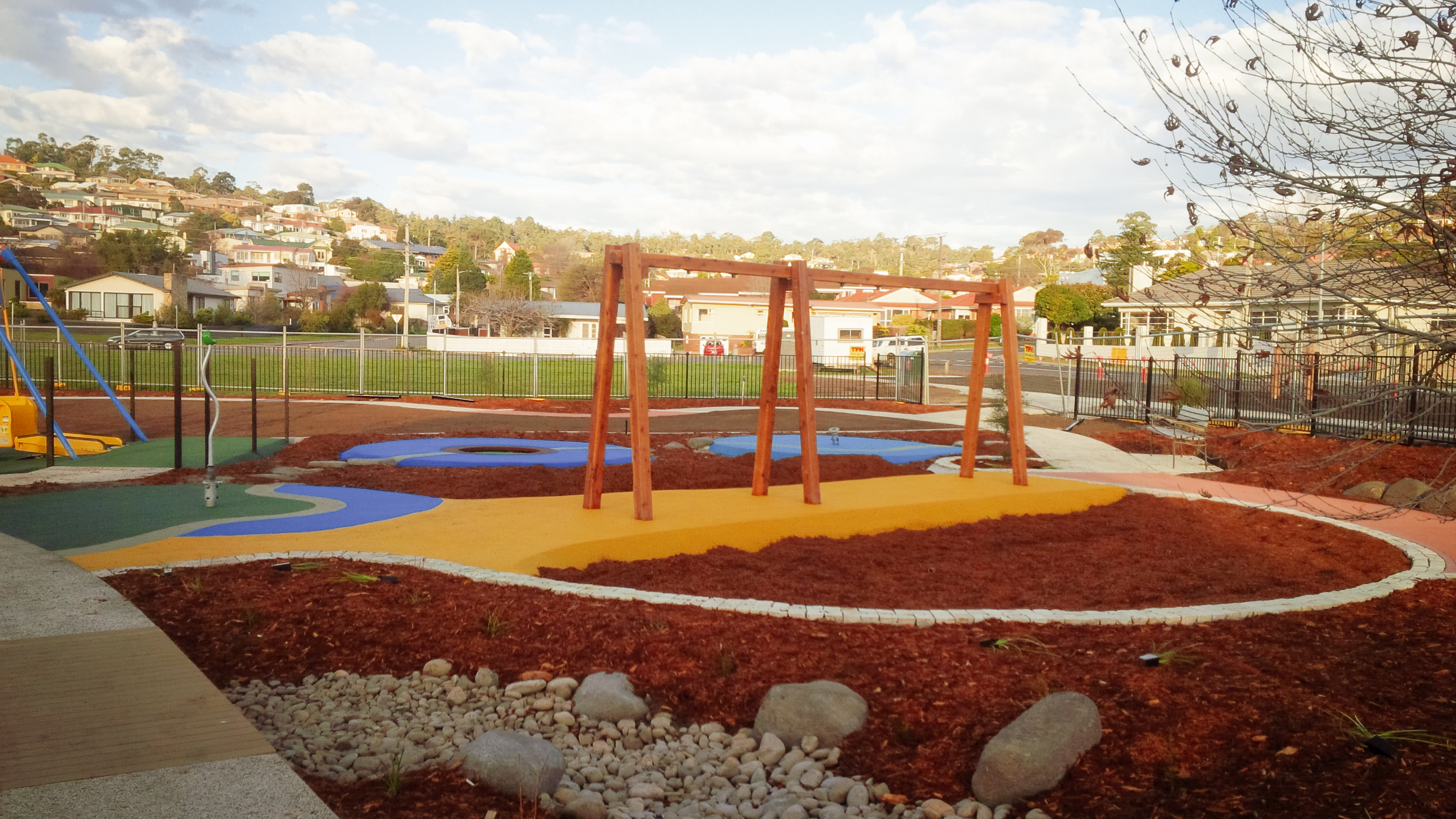 Kompan play equipment, instant turf, rubber softfall, Dolerite boulders, exposed aggregate and coloured concrete