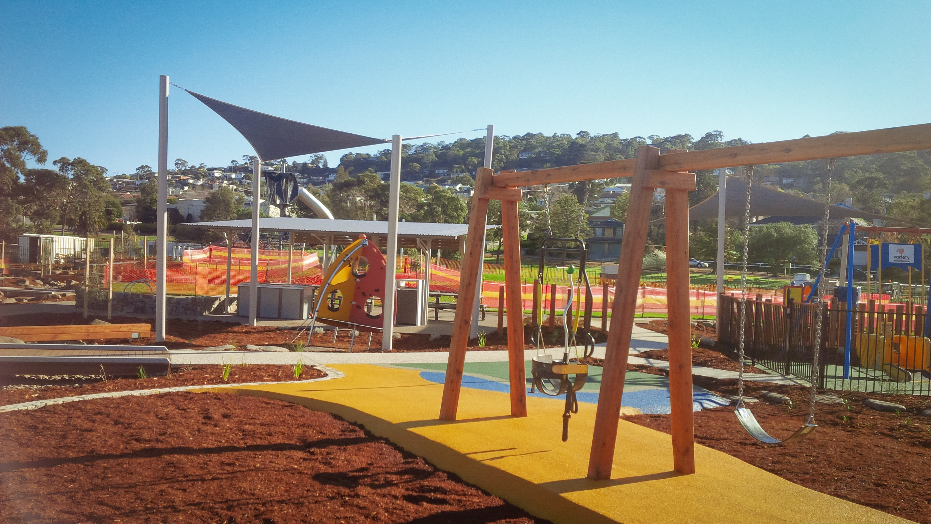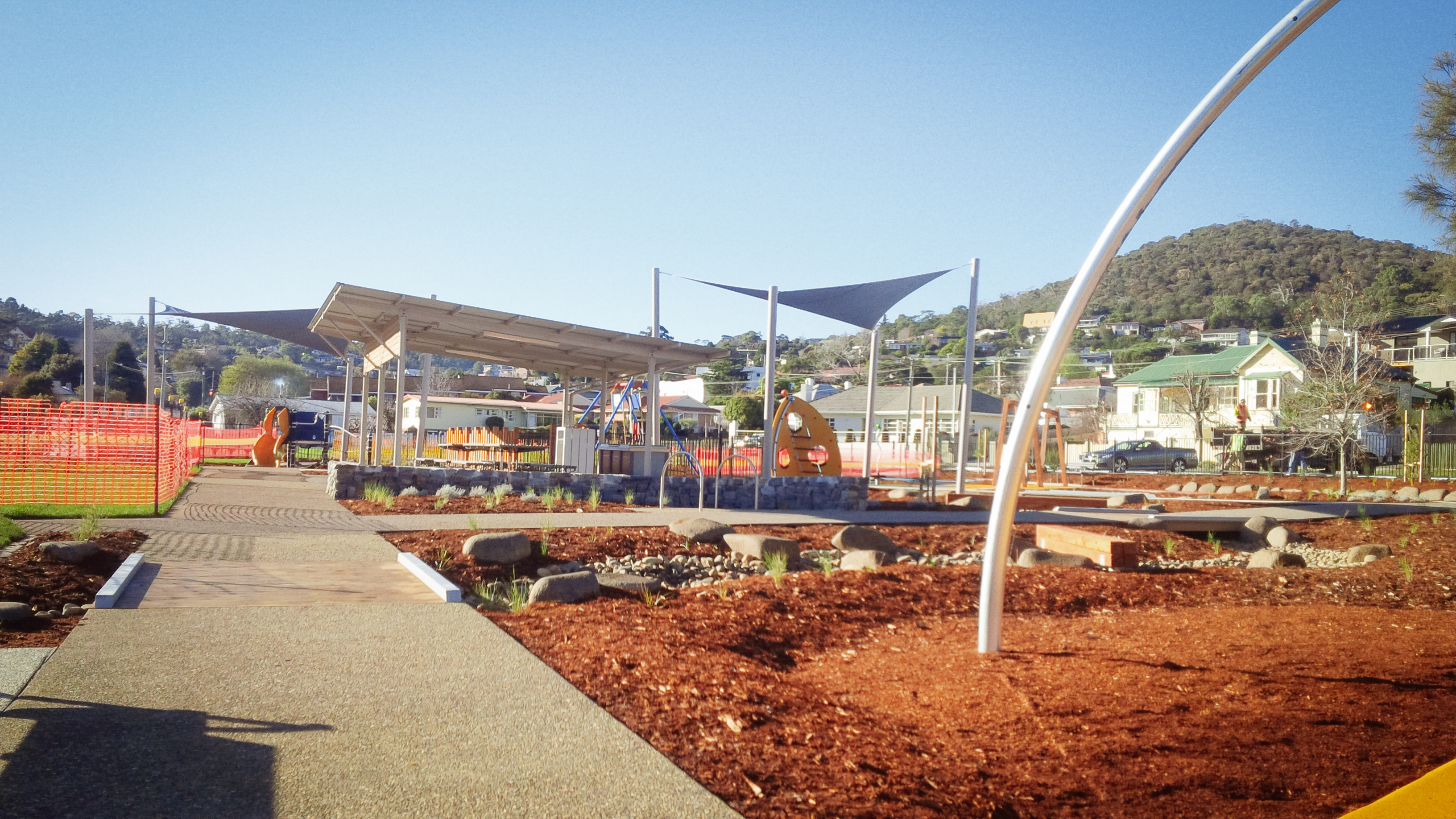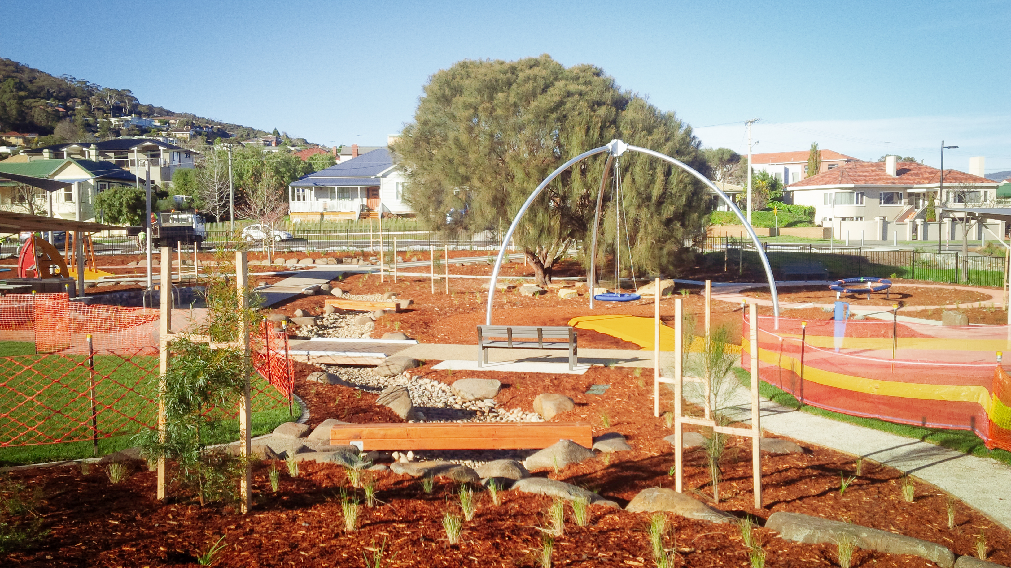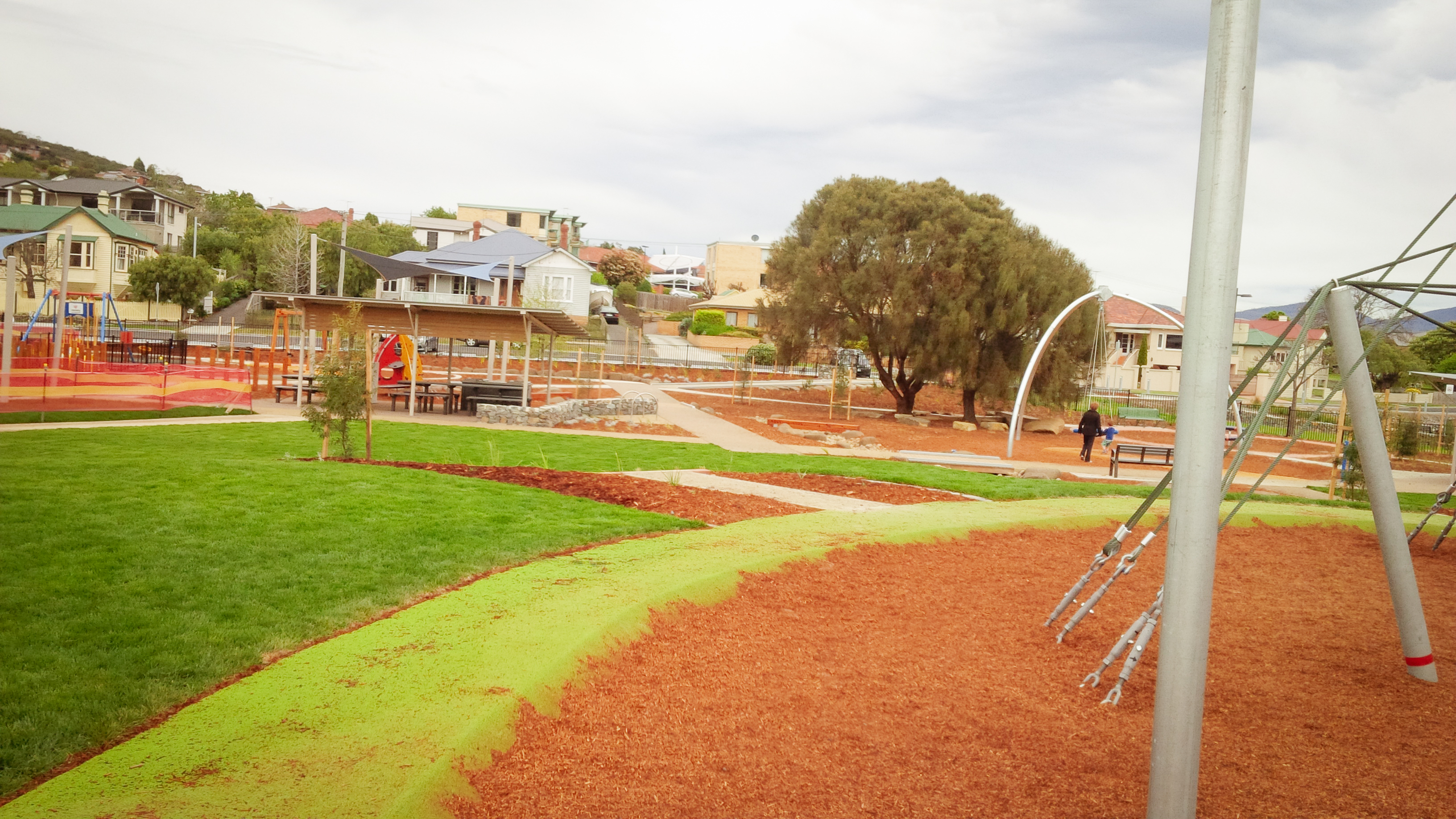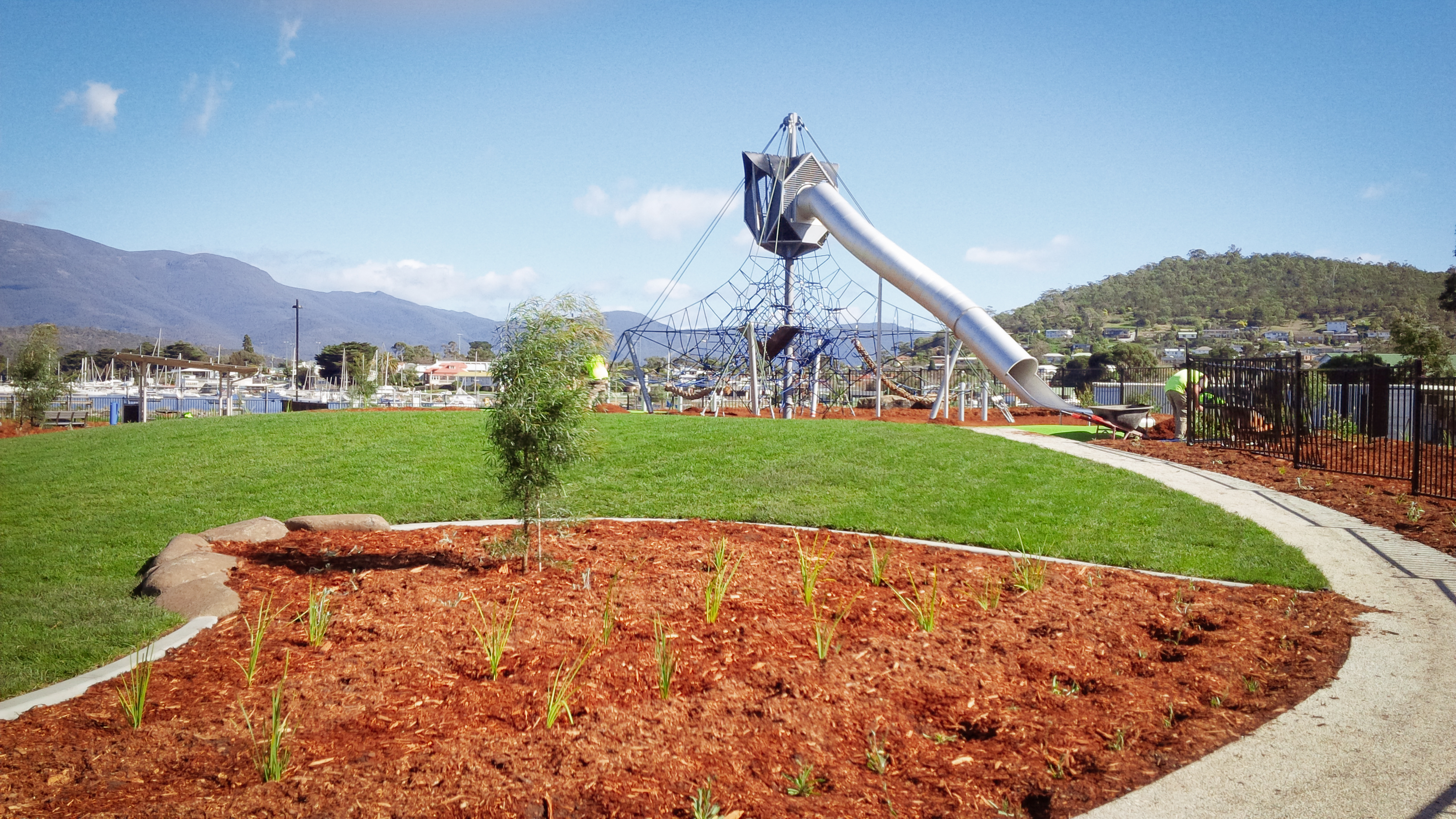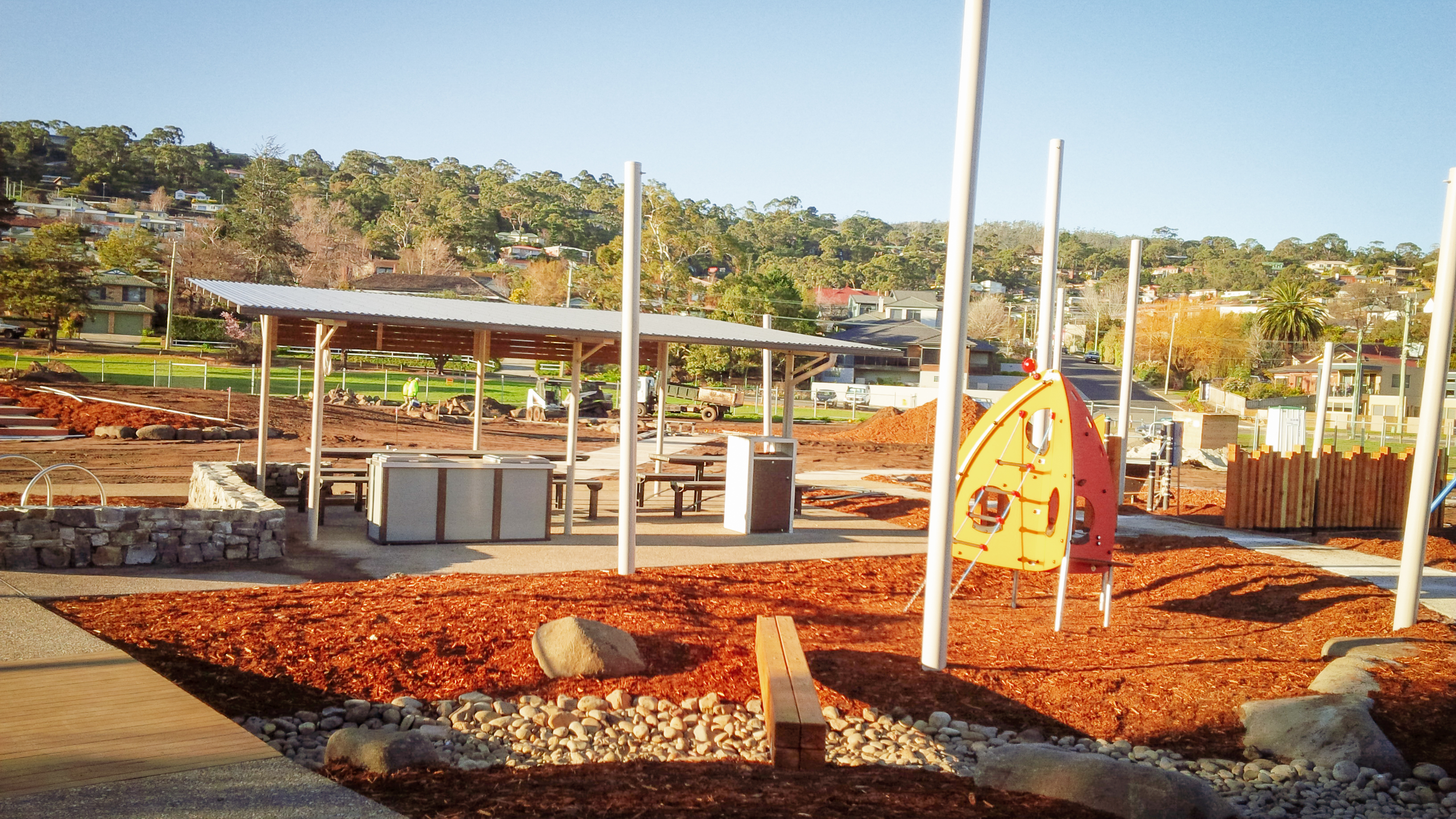 Kompan play equipment, instant turf, rubber softfall, Dolerite boulders, exposed aggregate and coloured concrete