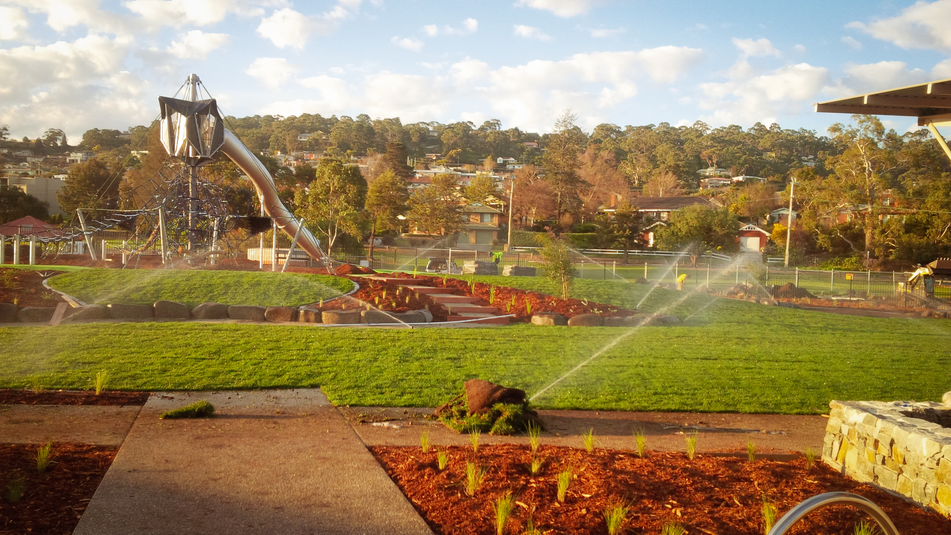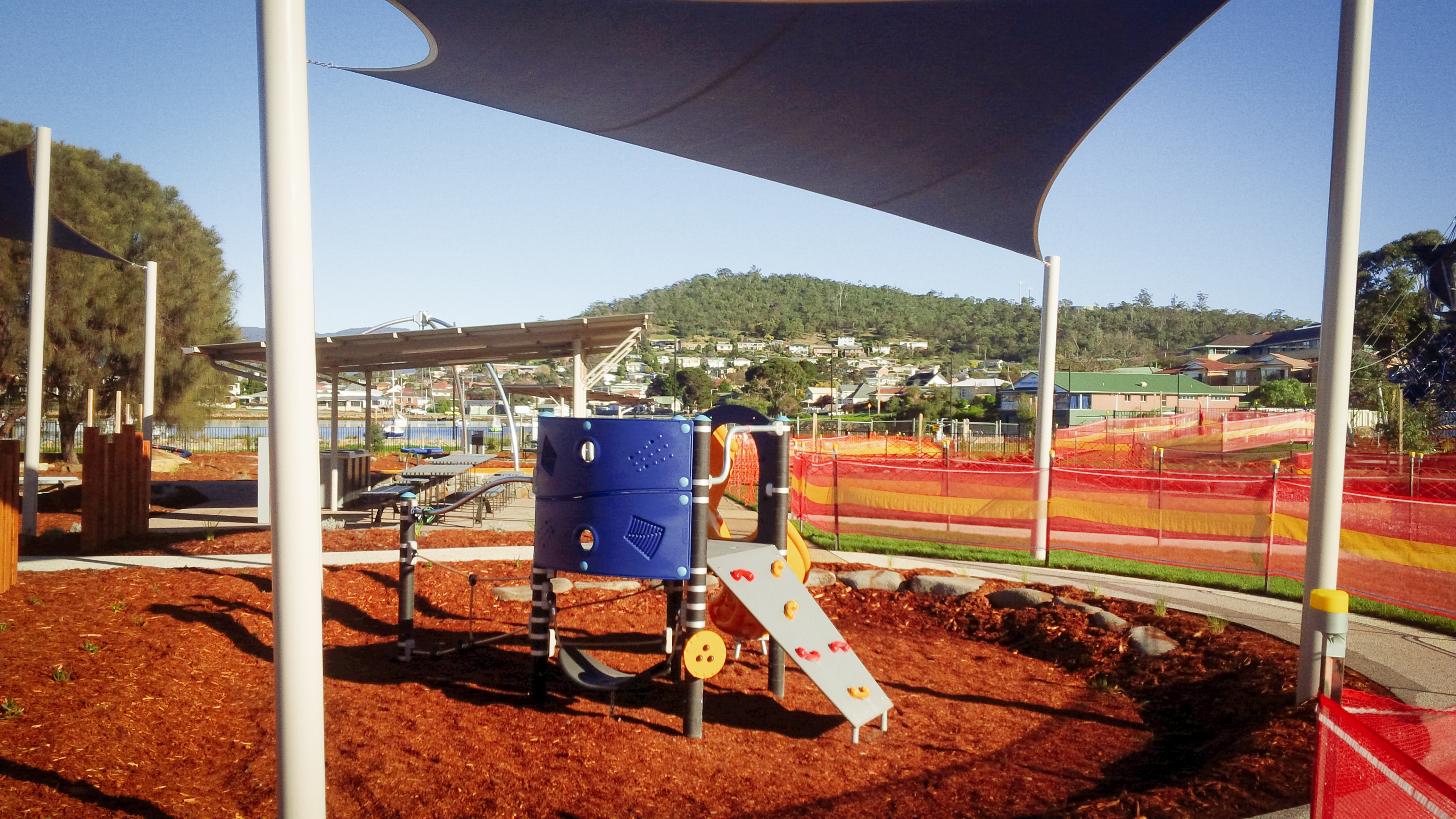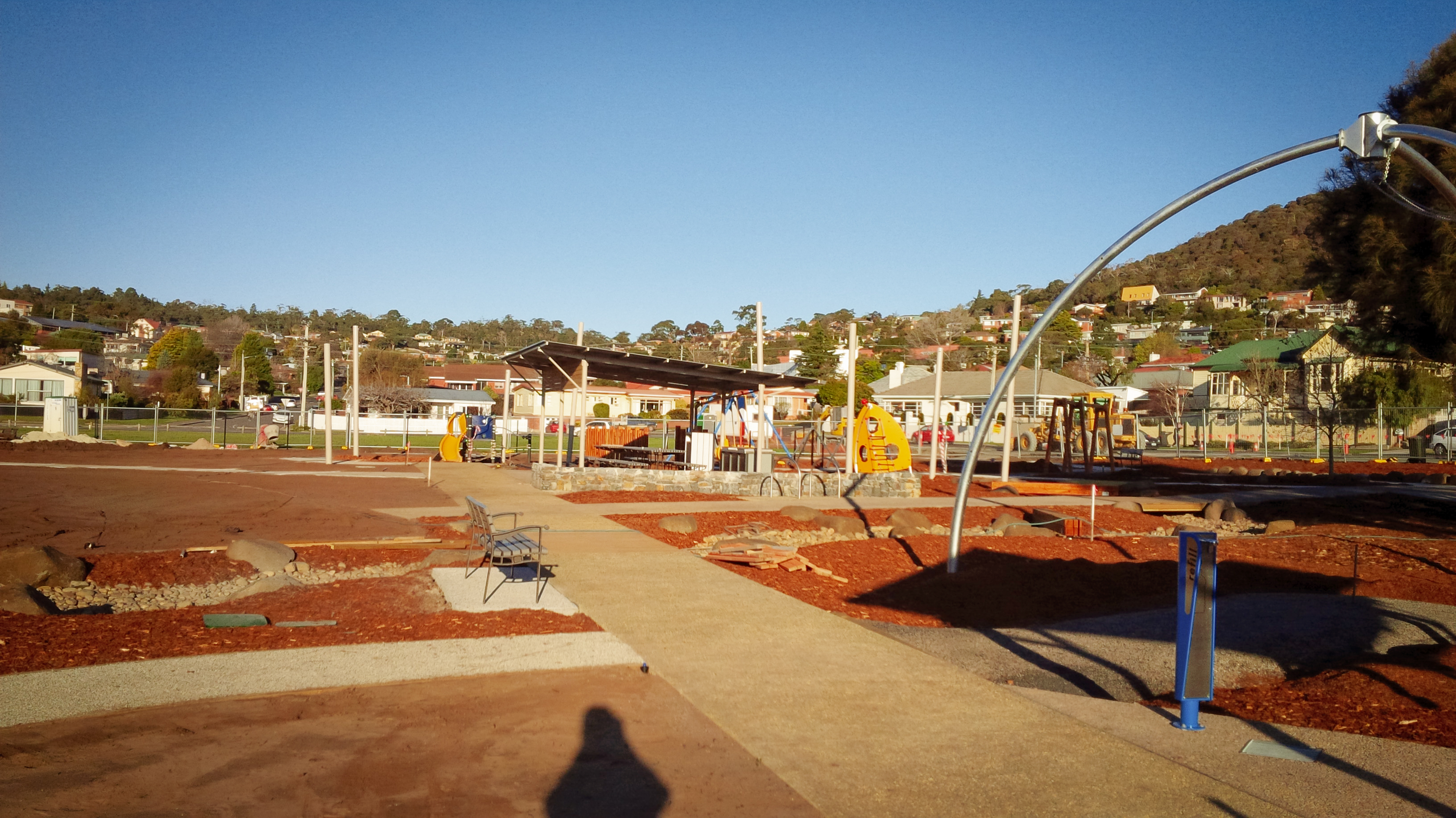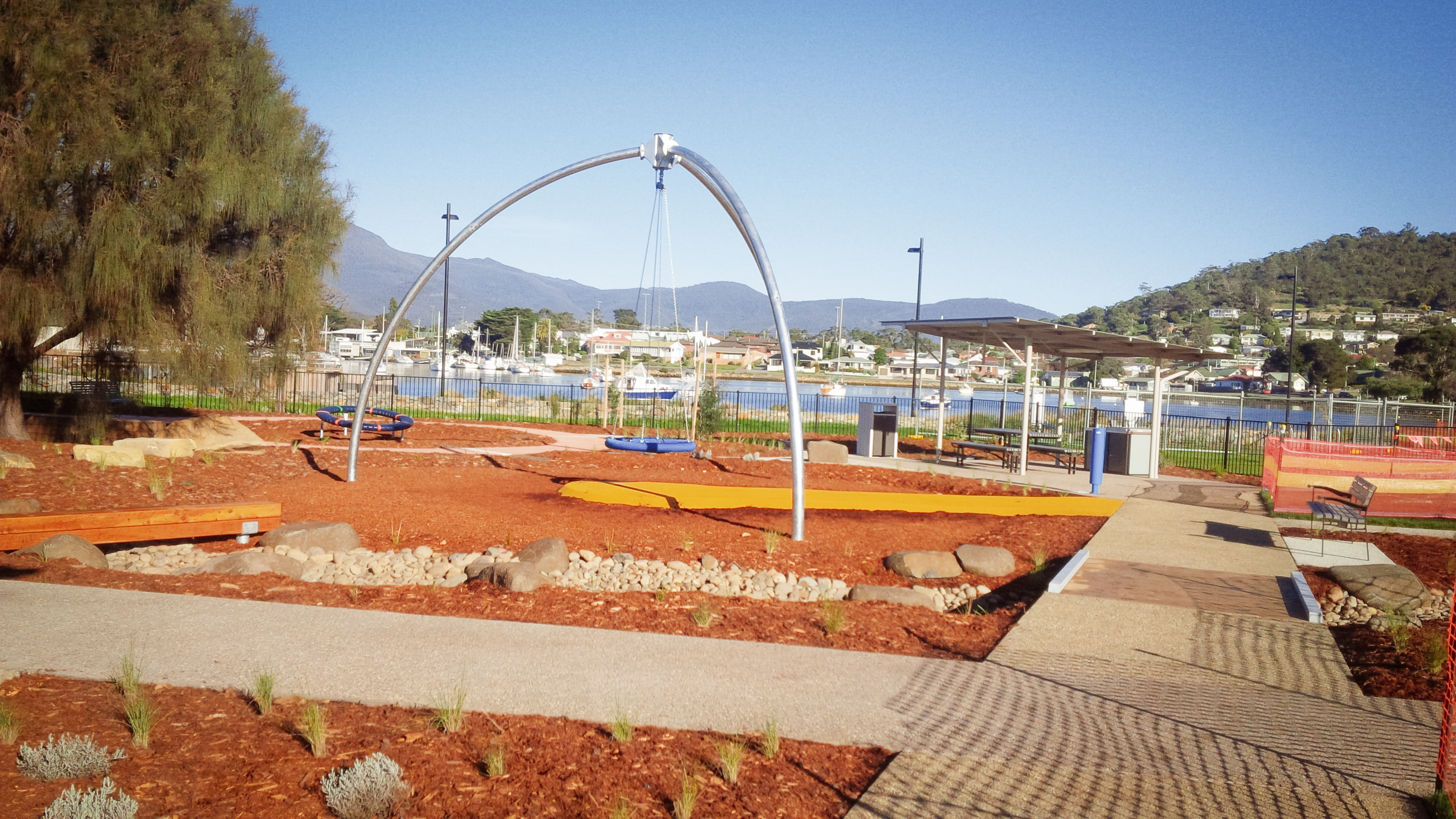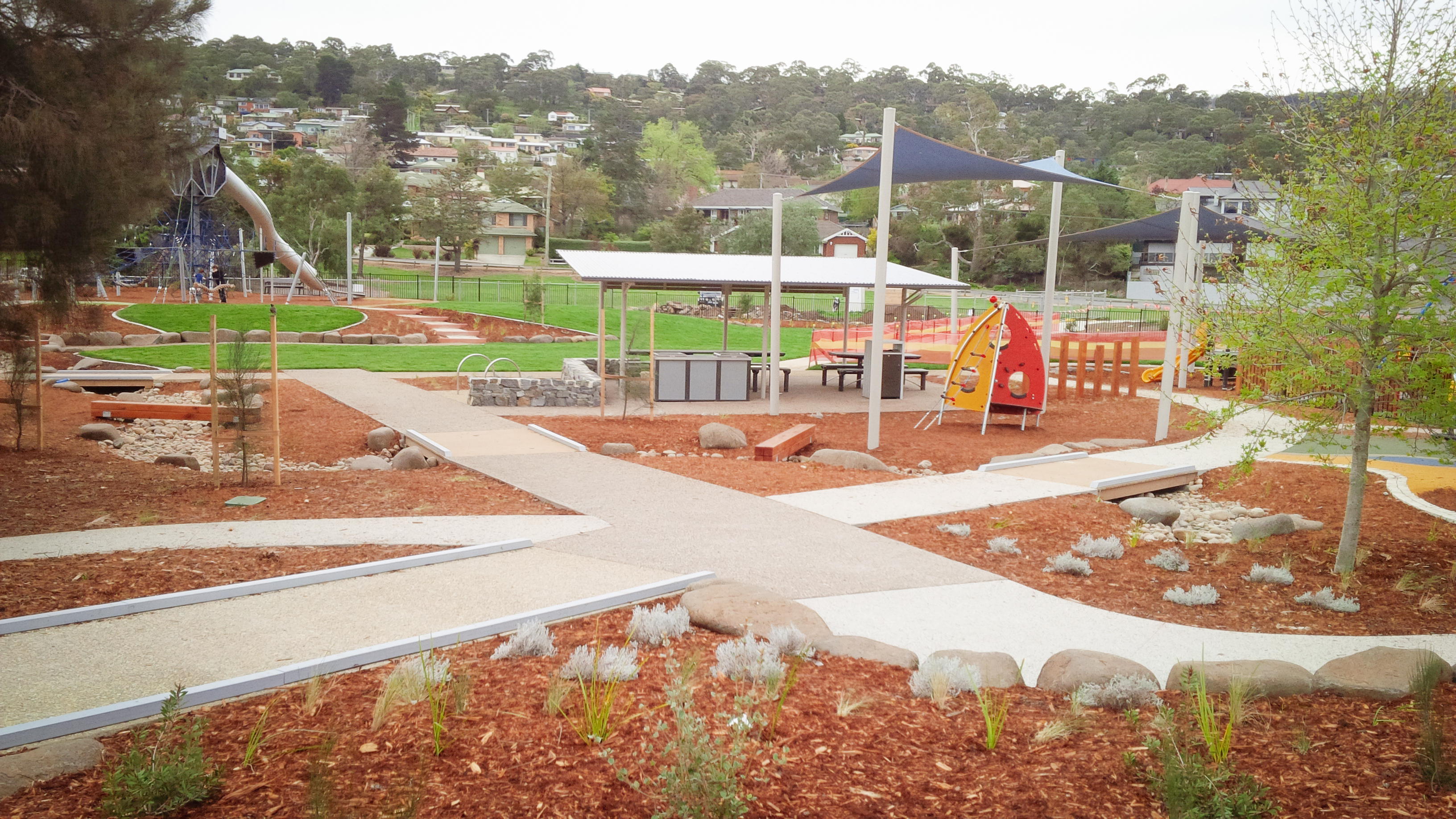 Kompan play equipment, instant turf, rubber softfall, Dolerite boulders, exposed aggregate and coloured concrete