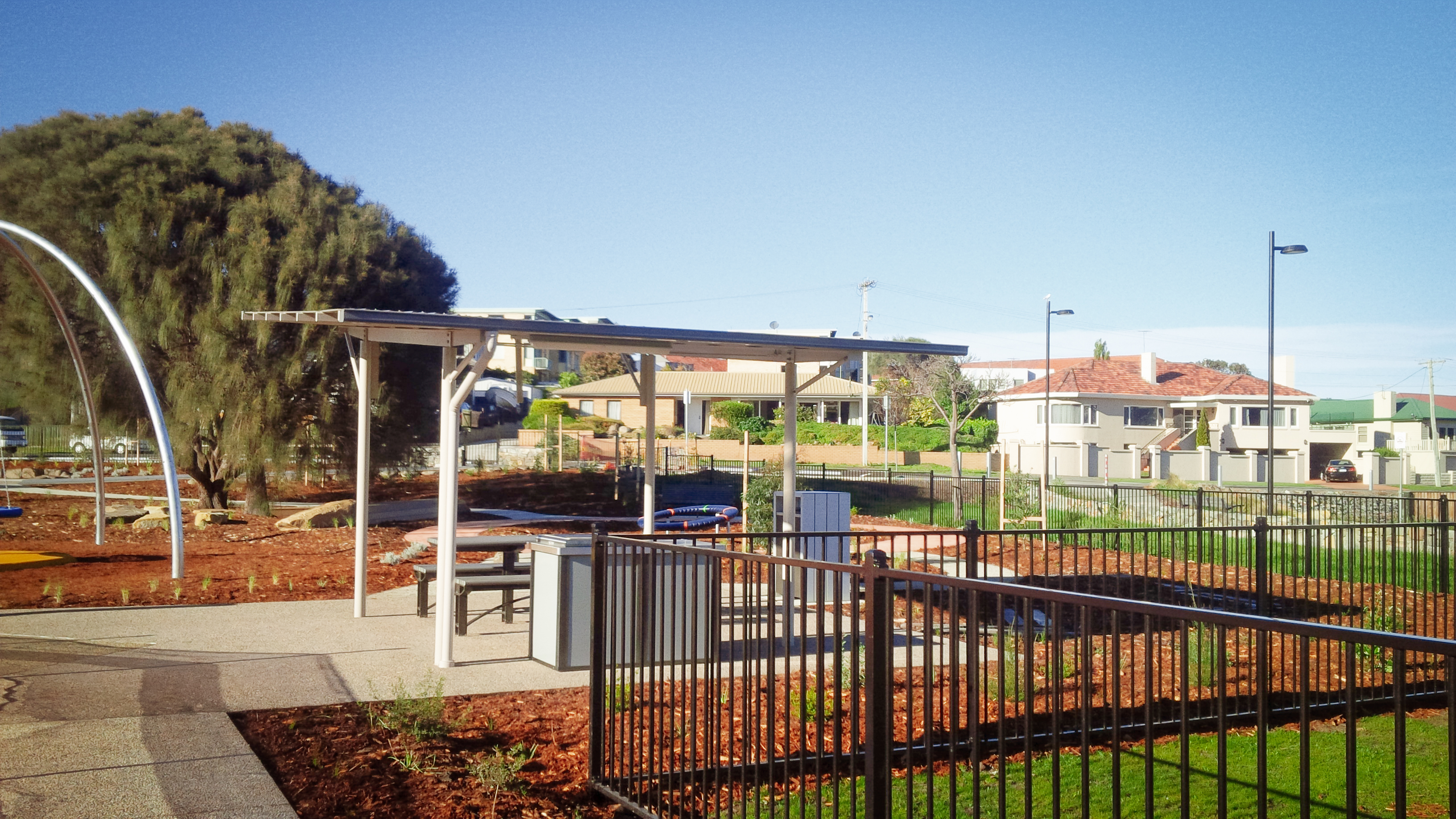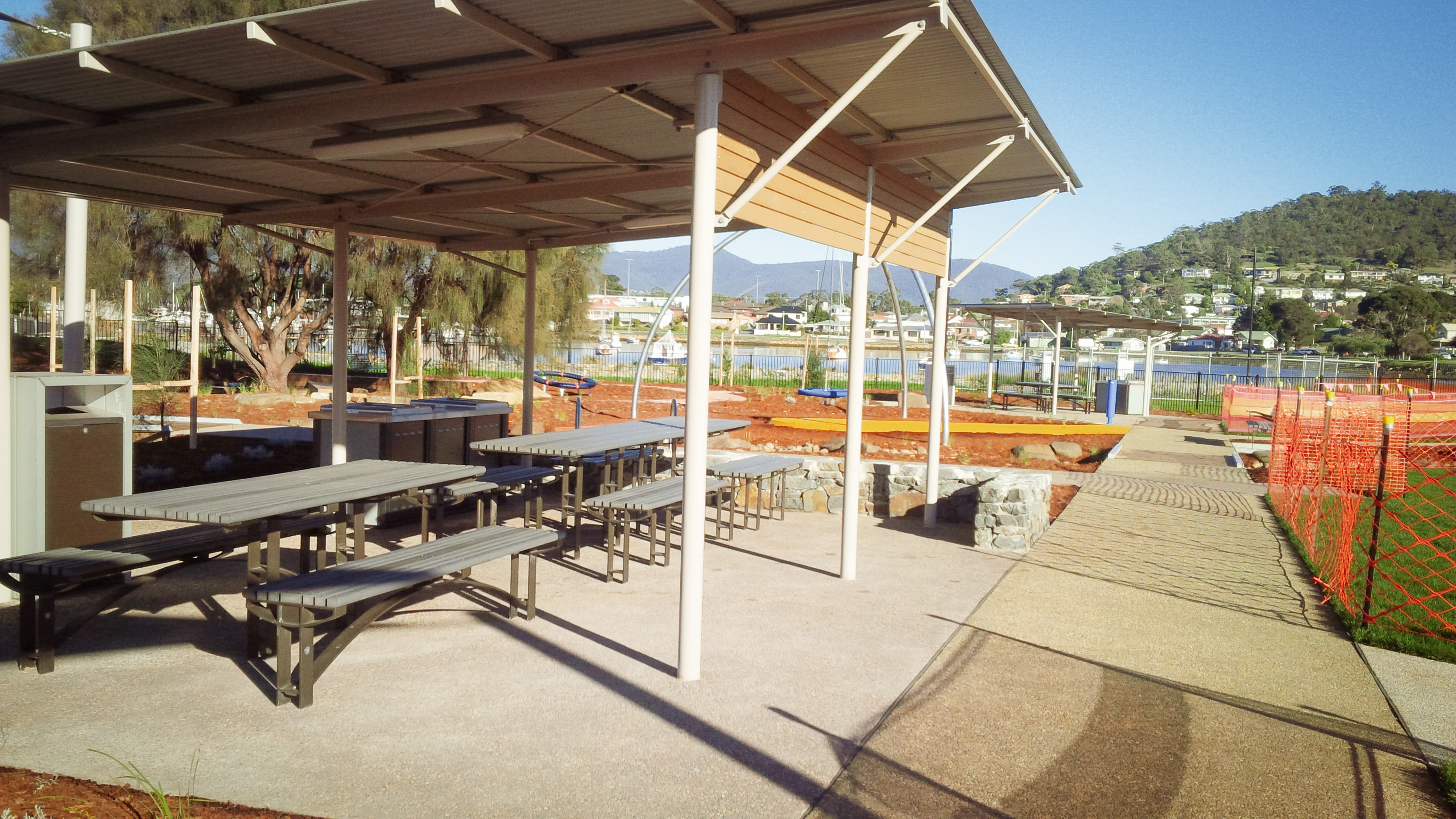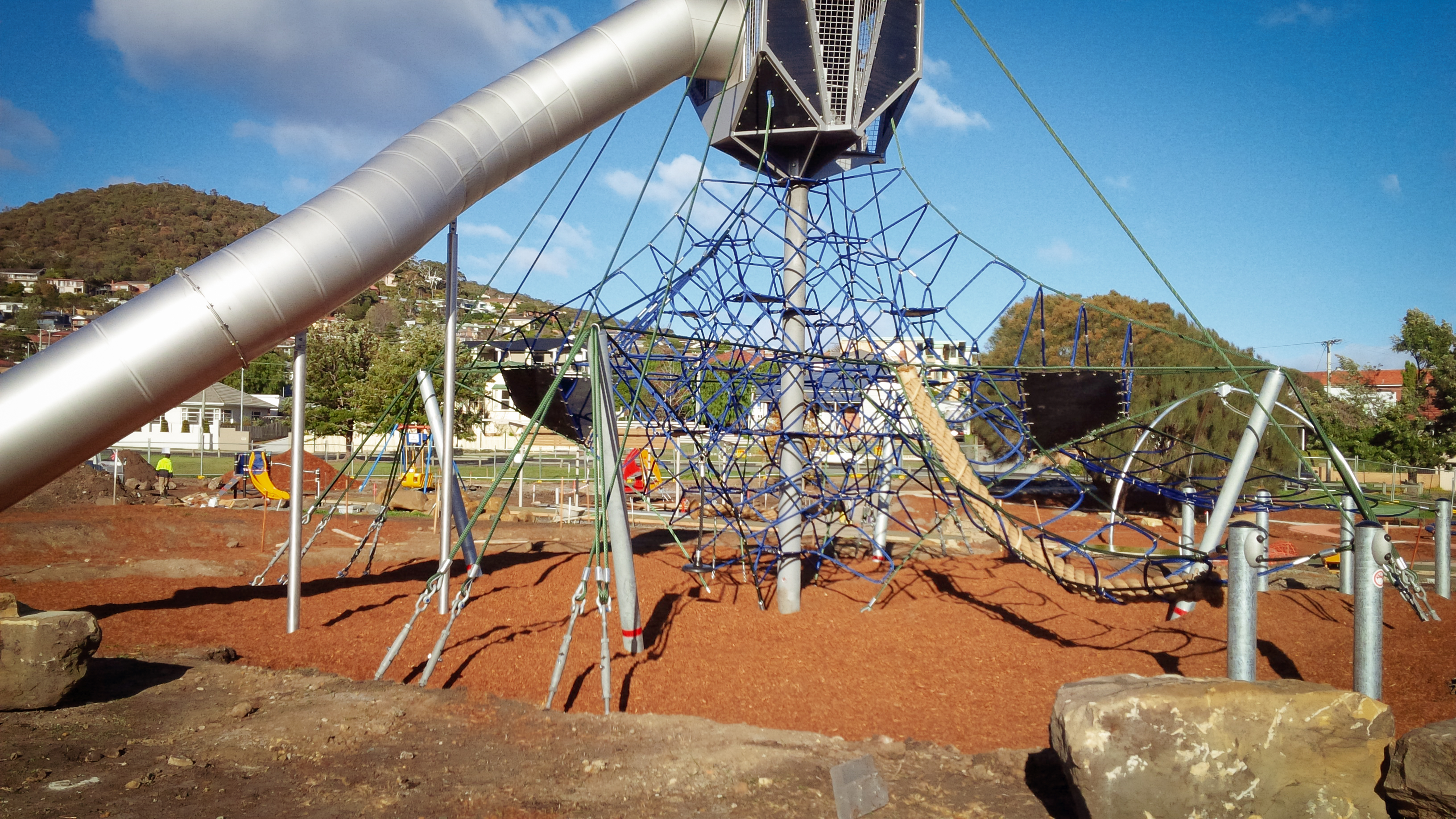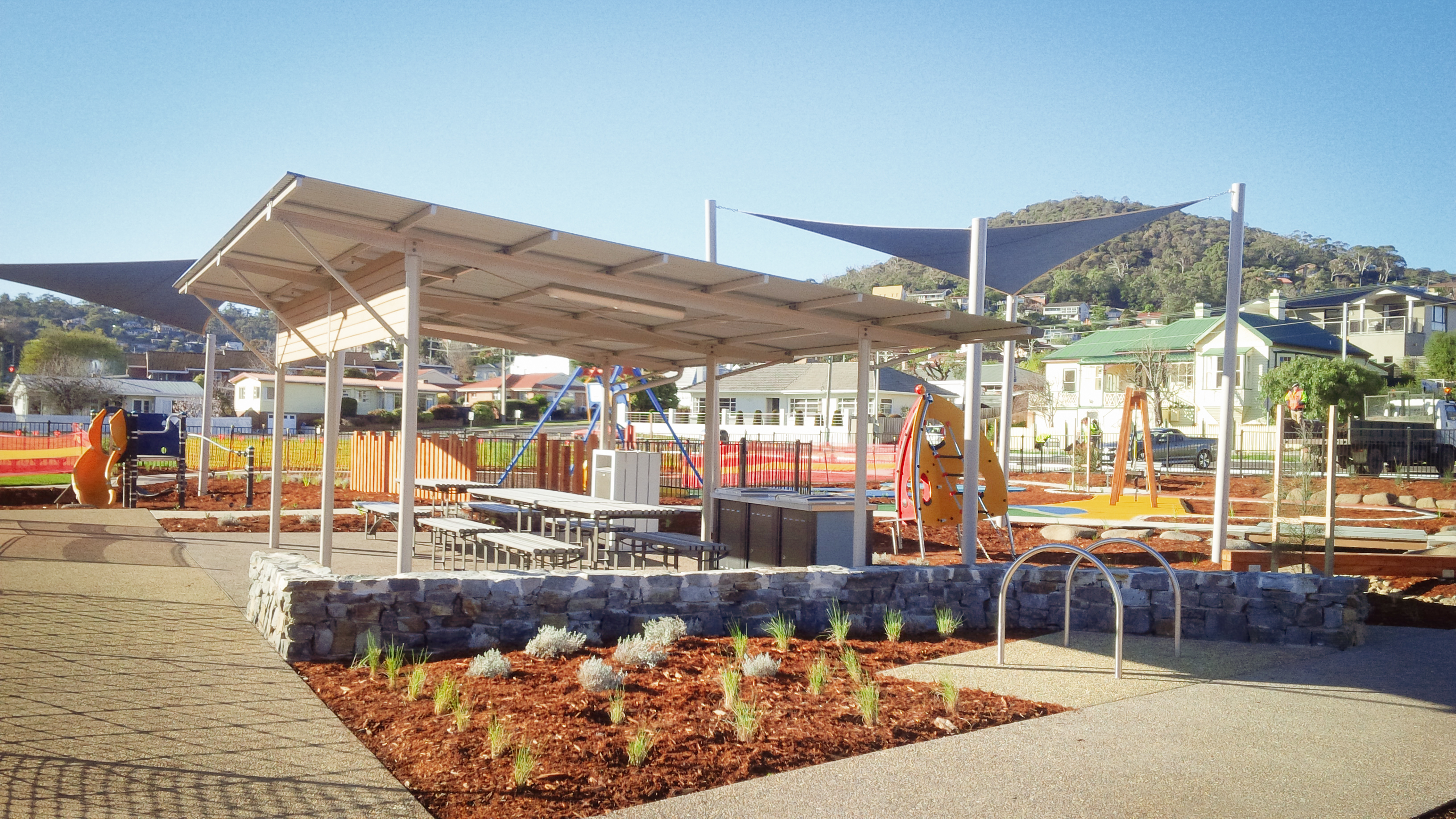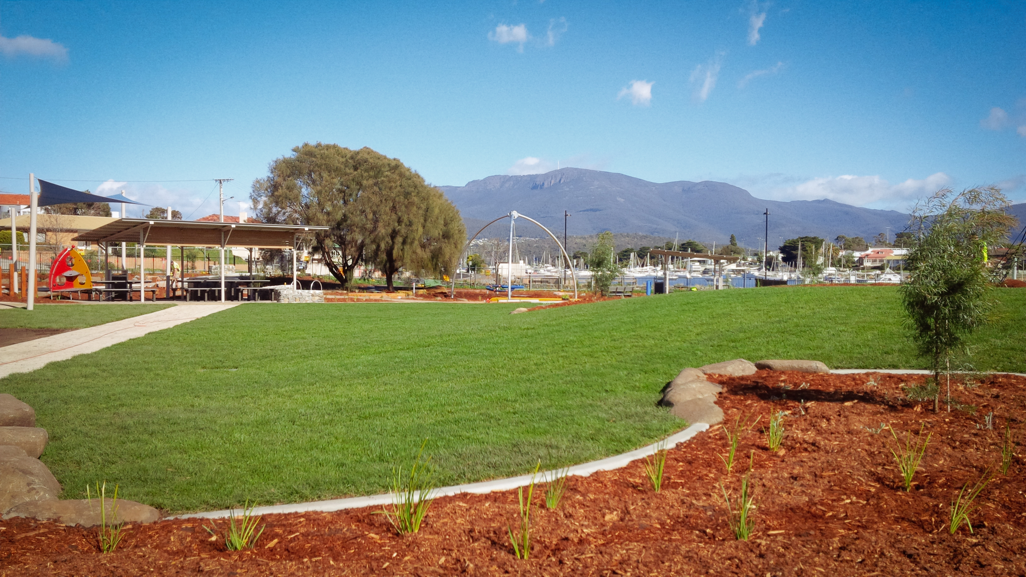 Kompan play equipment, instant turf, rubber softfall, Dolerite boulders, exposed aggregate and coloured concrete