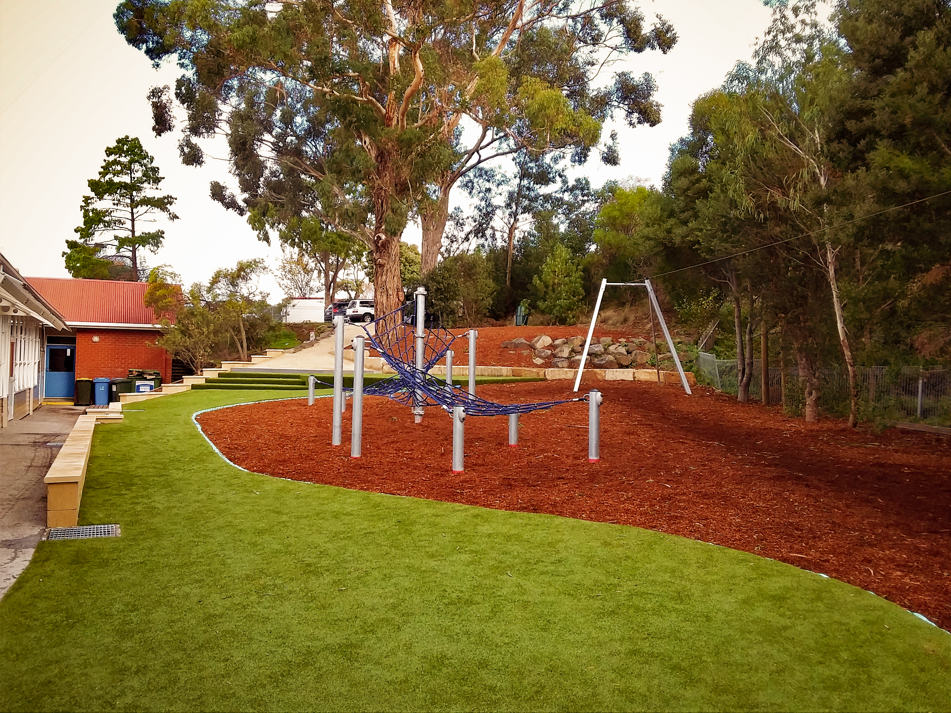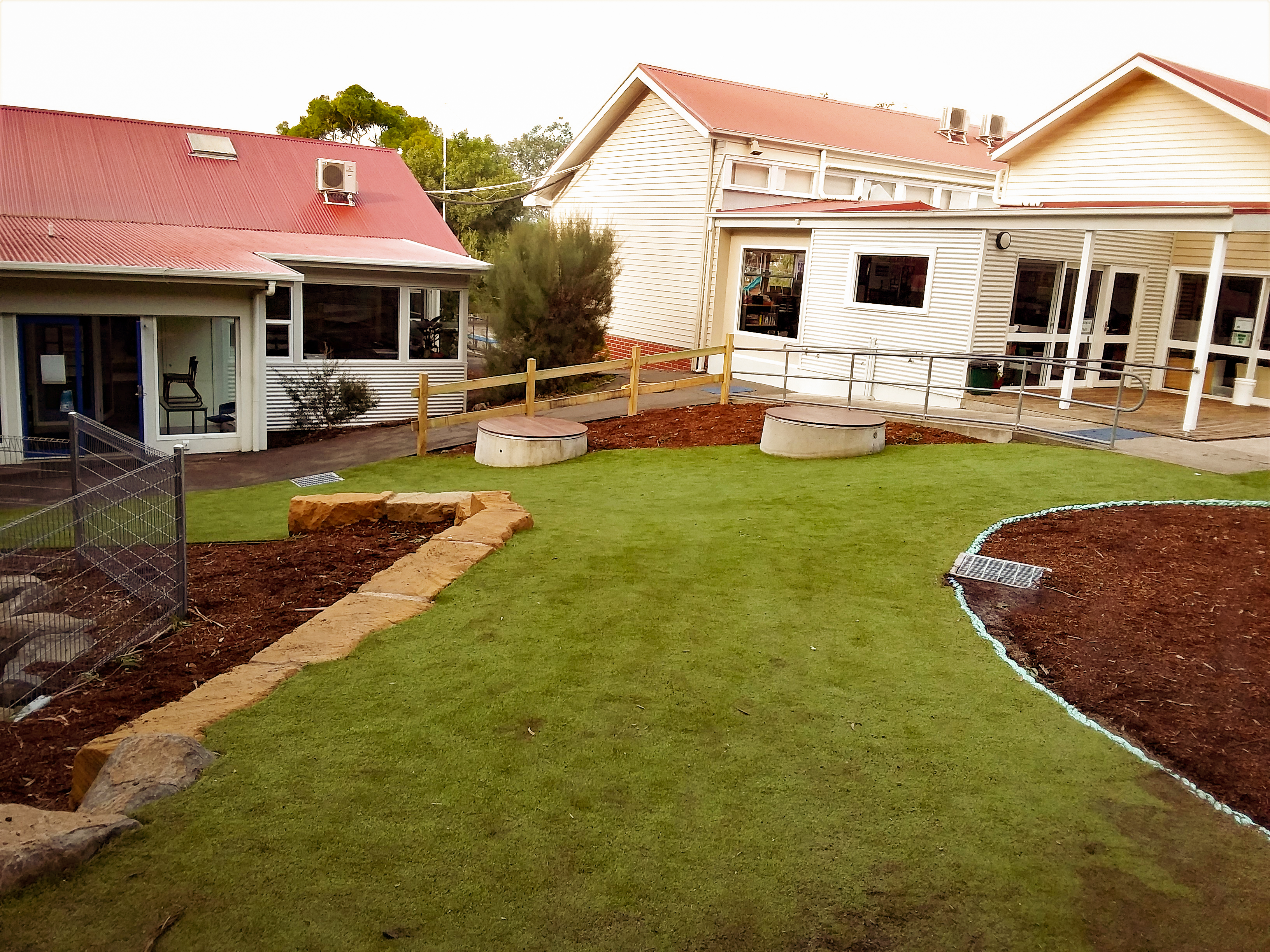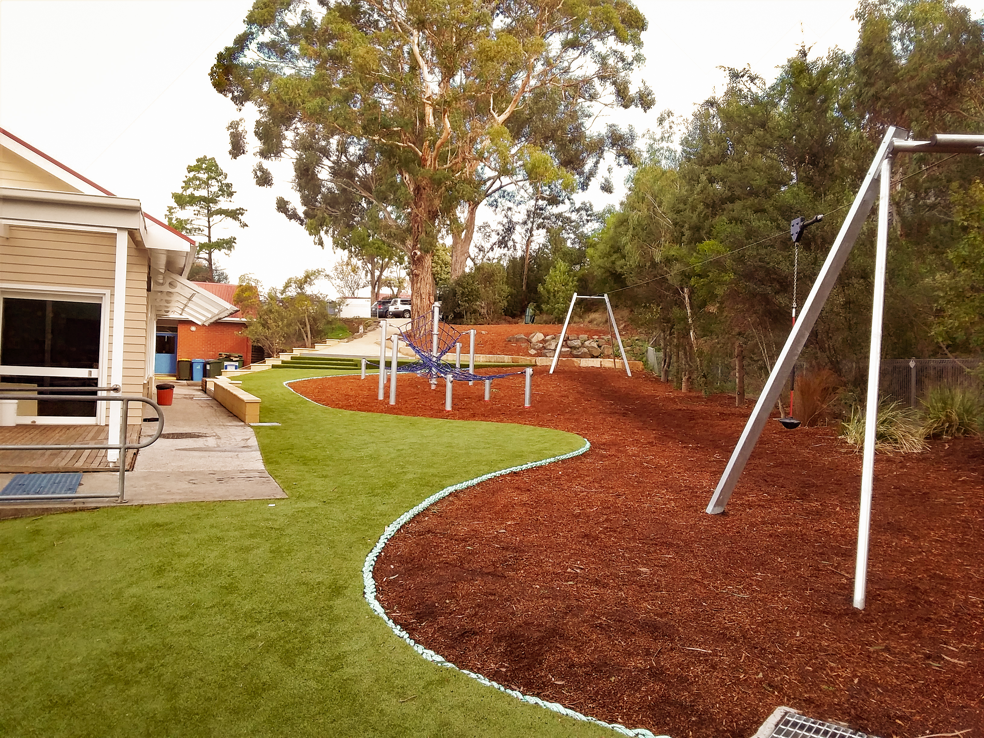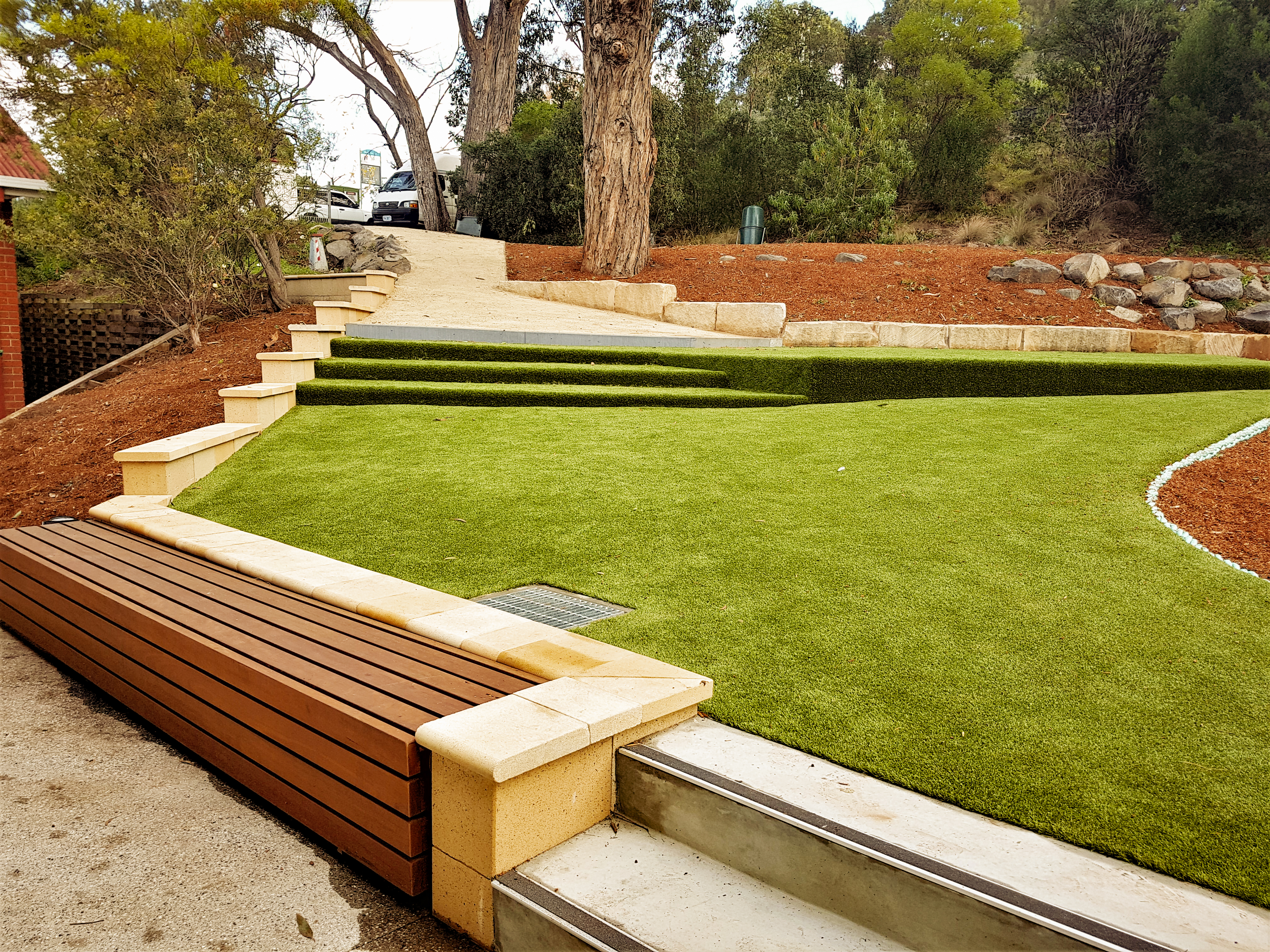 Synthetic grass, Kompan equipment, Dirtglue limestone gravel, Island Block retaining wall, exposed aggregate concrete